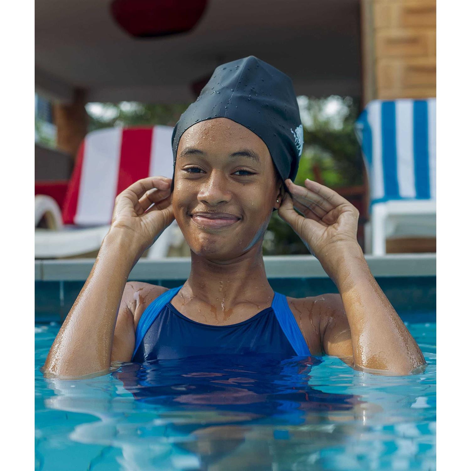 - Silicone stretches ensure Swimming cap Fit comfortably ensuring chlorine protection DURABLE HIGH QUALITY SILICONE.