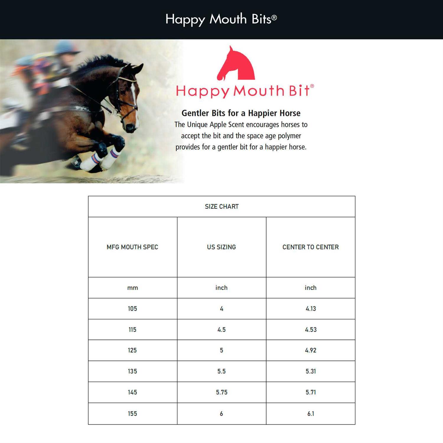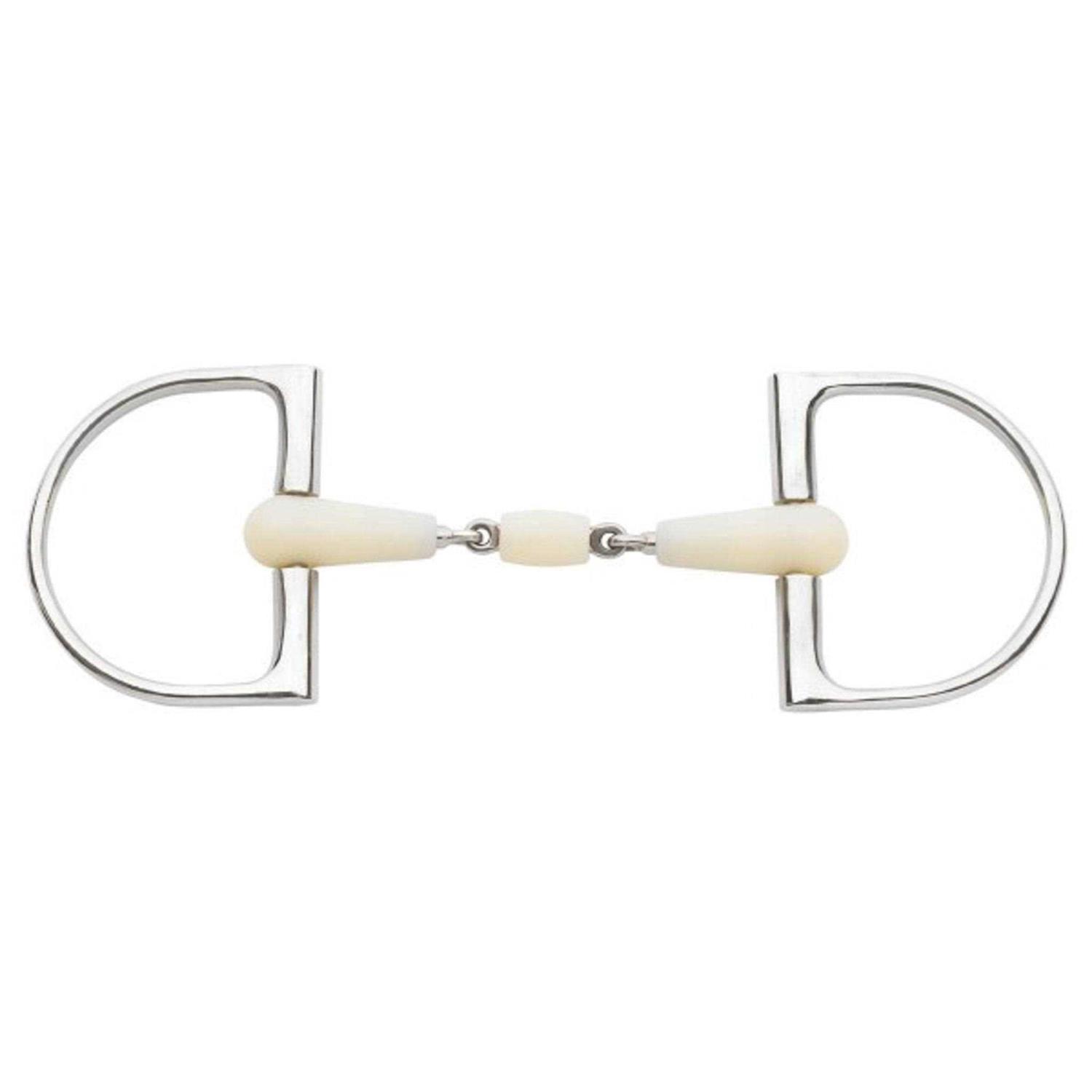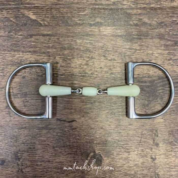 From Happy Mouth Bits, the Double-Jointed King Dee Pro Snaffle Bit has a stainless steel core and rings. The bit is covered in soft, flexible and durable apple-scented plastic to encourage acceptance and softness. Core and rings are stainless steel. The shape of the traditional cheeks provides some slight lateral guidance and helps prevent the bit from sliding sideways in the horse’s mouth.
