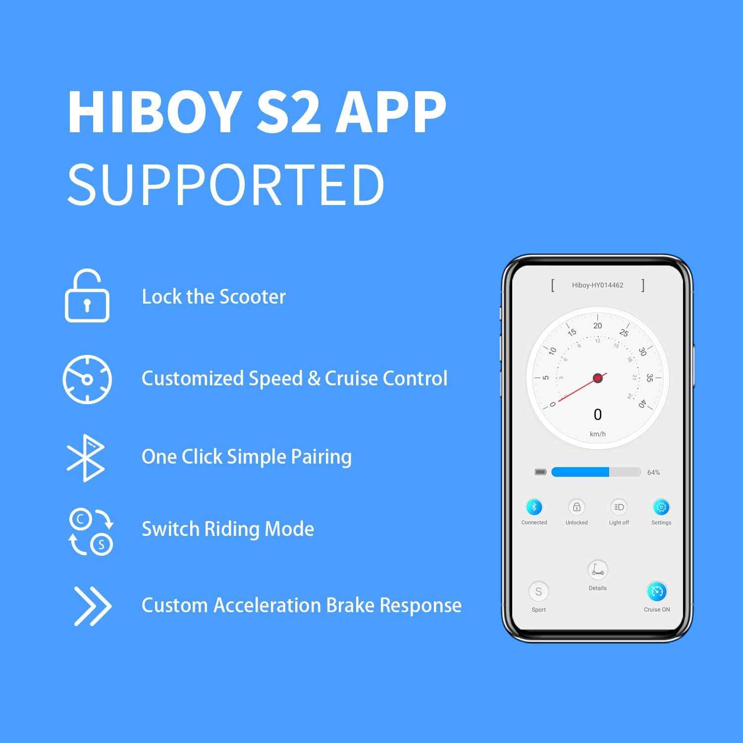 Powerful Motor & Long Battery Life The 500W electric brushless hub motor allows for speeds up to 19mph. High capacity battery (36V/11.6AH) with a Max travel range of up to 25.6 miles under specific conditions, and max load of 220 lbs. Upgrade Your Commuting Hiboy S2 Pro electric scooters front and rear wheel equipped with 10-inch solid tires and rear dual shock absorbers provide max comfort, even on rough surfaces or speed bumps. Safety with Hiboy Scooter Hiboy e-scooter features the ultra-bright headlights with a range of up to 15 meters to enhance safety. And double braking system features a disc braking and eABS regenerative anti-lock braking. Perfect for Commute and Travel Hiboy e-scooter collapses for easy storage in car trunks and other compact spaces. Extra detachable scooters seat is available for a more comfortable option. (Seat NOT included) Hiboy S2 App Simply connect Hiboy electric scooter’s app to lock your scooter, to customize the scooter acceleration and braking responses.