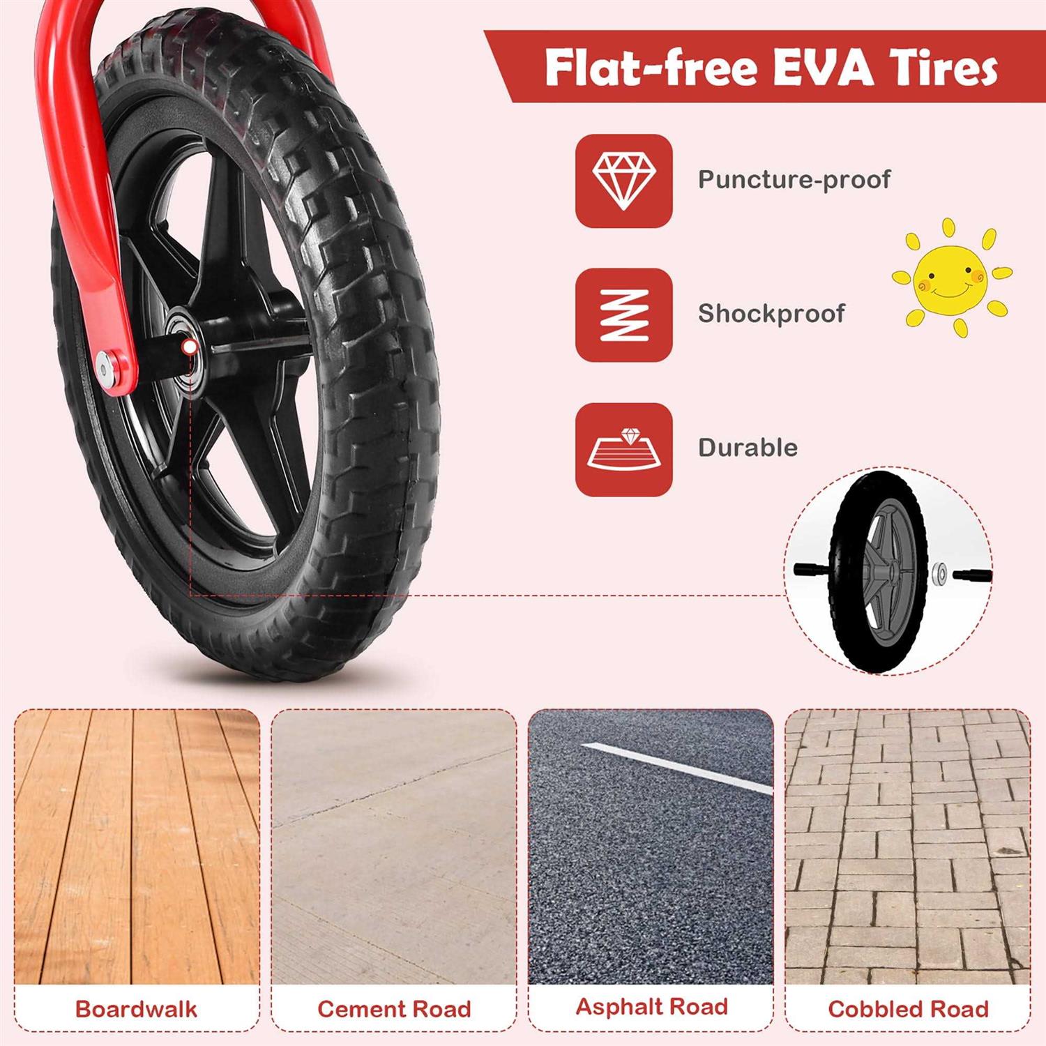 Made of sturdy yet lightweight carbon steel frame, this kids balance bike is durable and portable for kids to carry. What’s more, the puncture-proof and shockproof Eva tires fit various roads for practicality.