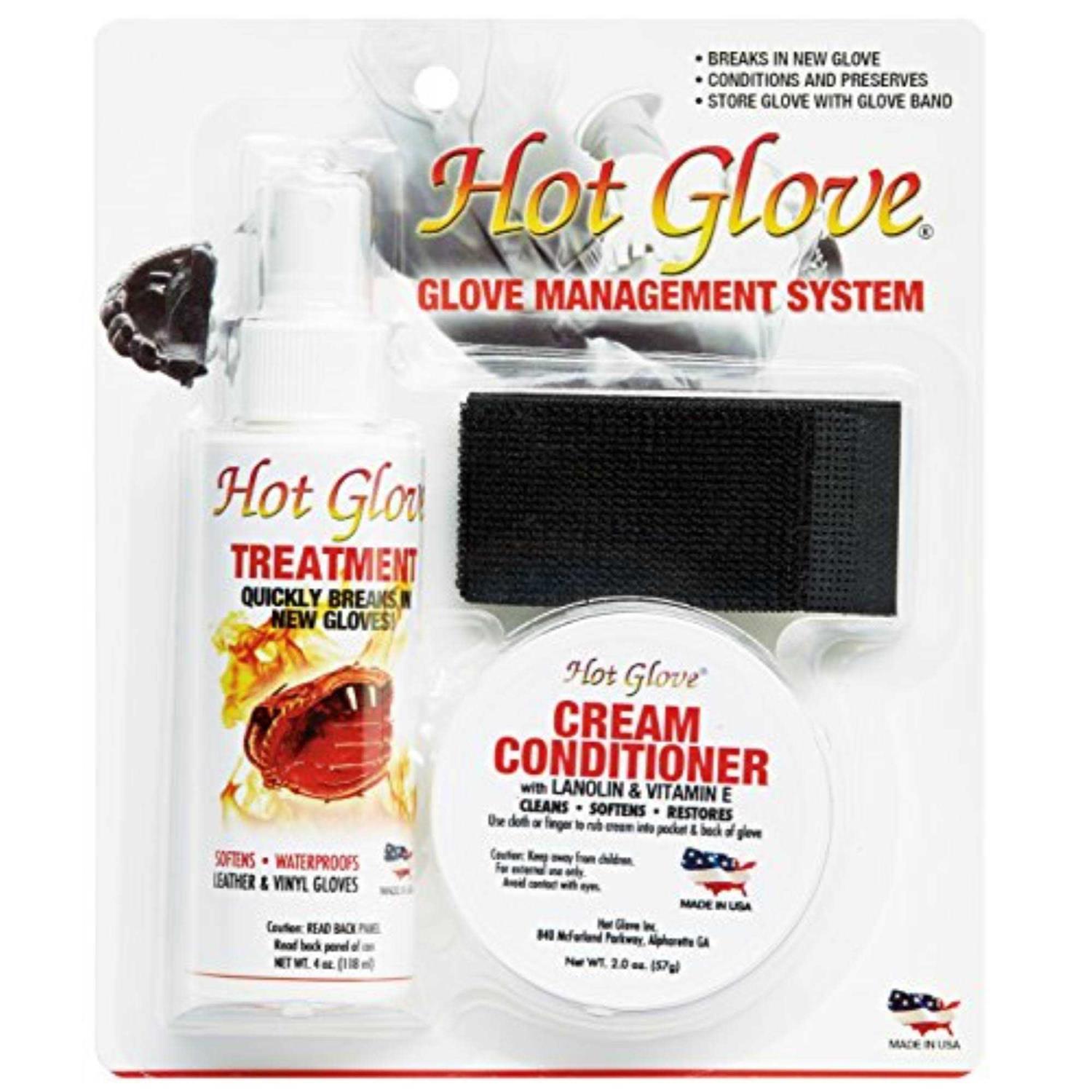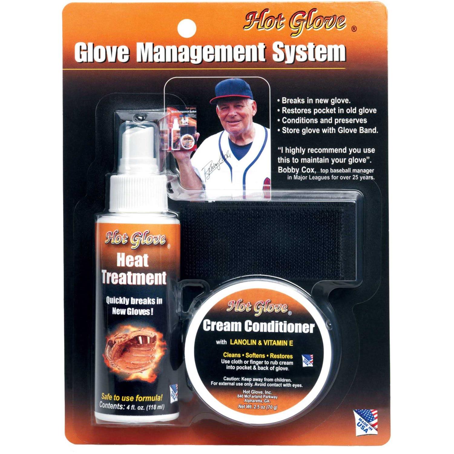 Hot Glove Management System contains everything a player needs to break-in and maintain a glove. The system consists of:1. Hot Glove 4-minute Miracle Treatment spray pump. Hot Glove is the quick, easy and safe way to break in new leather or vinyl baseball gloves. Makes gloves ready for use with nice, comfortable catching pocket in minutes. Successfully & safely used on millions of gloves for over 15 years.2. Cream Conditioner for waterproofing, preserving and prolonging the life of the glove. Recommended for use after Hot Glove Heat Treatment.3. Glove Wrap Strap to preserve and ingrain ball pocket after Hot Glove Heat Treatment. Just place ball into pocket and secure strap around glove.