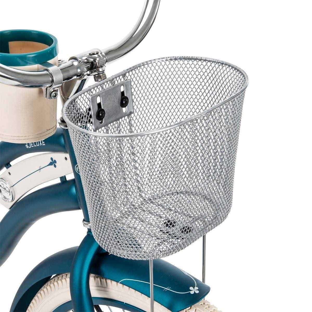 The Huffy 24-inch Deluxe cruiser provides comfort, style, and convenience. The exclusive Perfect Fit frame is uniquely designed for superior comfort. Hop on and you will immediately notice the difference. The frame provides a natural riding position, which benefits your back, arms and hands. The padded spring saddle, dual density grips and pedals, and an easy-to-use coaster brake make this one-speed cruiser truly deluxe. Extra features deliver more convenience – your favorite beverage fits in the handlebar cup holder; the roomy front basket is a great place to stash your keys, phone and jacket; and the rear rack is perfect for transporting books or work items.
