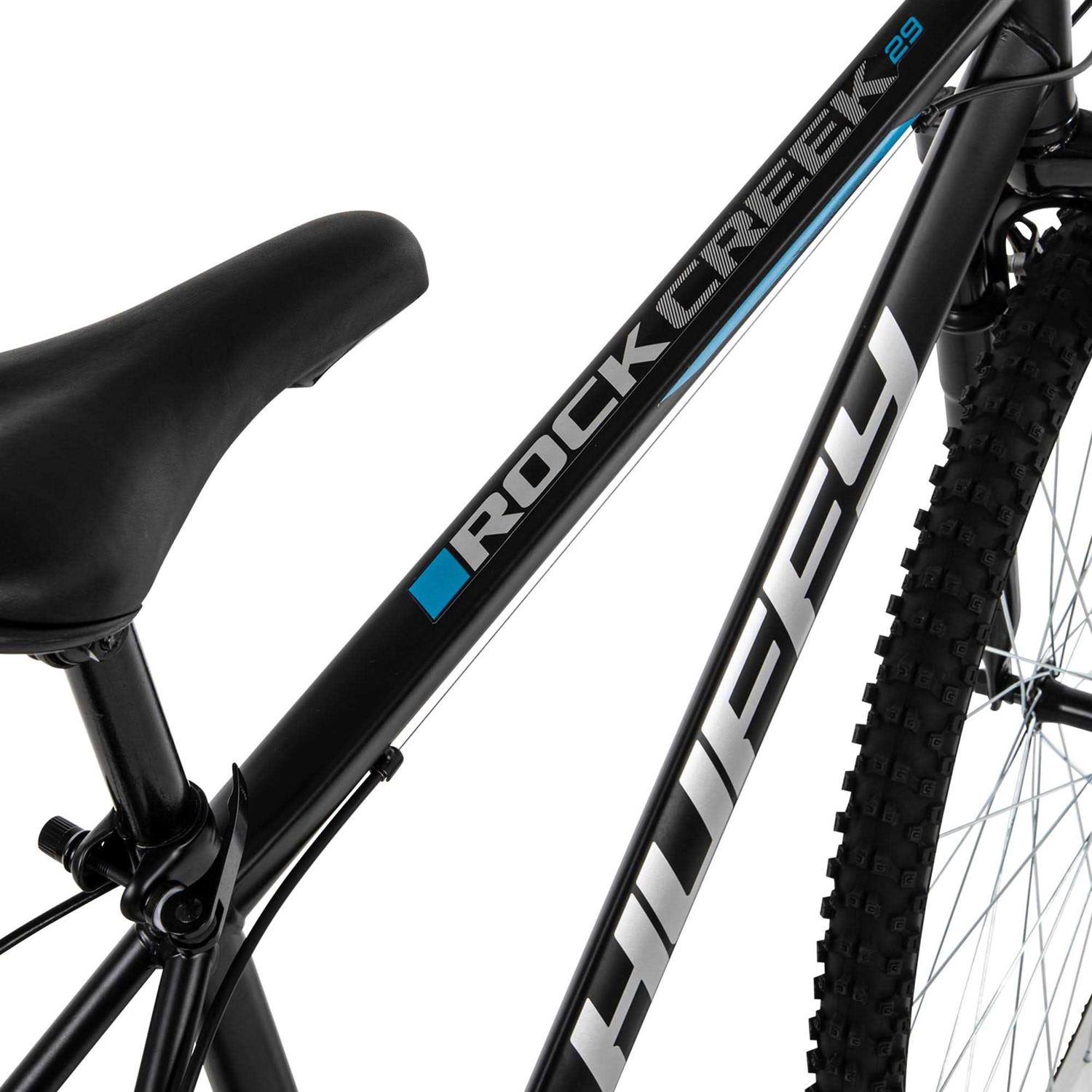 The Huffy Rock Creek 29-inch Mountain Bike in matte black combines a combines a durable steel mountain frame with suspension fork to deliver a great ride, great style, and the right specs for a great ride over any terrain. Smooth 18-speed index shifting system with a Shimano rear indexed derailleur easily shifts between gears for powerful pedaling uphill or accelerating on level ground. The steel linear pull brakes on this 29 mens mountain bike allow for quick and smooth braking or steady speed control as you ride, while the Knobby tires grip the terrain. The slim ATB seat includes an alloy quick-release seat binder for easy adjustments to the ensure youre riding comfortably at the perfect height, or to remove when needed. Huffy Kraton grips add comfort and a great hold while you enjoy your adventures on the Rock Creek Mountain Bike from Huffy. To see Huffy Mountain Bikes and other adult or kid products in action, visit our YouTube channel! For more Huffy Content, visit our Instagram Page!