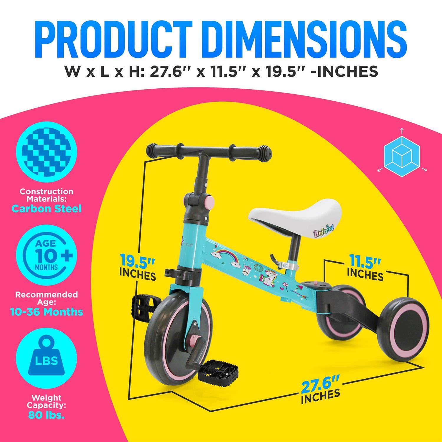 3 MODES: The 3-in-1 toddler bike serves as a multifunctional toddler tricycle w/ sliding, pedal & balance bike modes, helping your kids to confidently learn balance, steering coordination, pedaling & riding. Designed for 10 month to 3-year old kids ADJUSTABLE SEAT: Features removable pedals & adjustable seat height perfectly suitable for the growing baby. Excellent indoor baby walker toy develops kids balance and helps kids gain balance, steering, coordination, and confidence at an early age DURABLE CONSTRUCTION: These trikes for toddler features a safety carbon steel frame and durable widen silent wheels that are strong enough for riding indoor or outdoor. Soft handle grips and the cushion seat make kids’ riding comfortable EASY TO ASSEMBLE: Effortlessly connect each modular part & build the tricycle in 10mins following the guide in the packaging. Change between the 3 modes simply by the press of a button, lock the fork angle between the 2 rear wheels for safe riding SAFE & SMOOTH RIDING: The three big wheels offer a smooth & easy ride/walk for infants. Their feet could touch the floor easily & ride steadily with no fear. Makes a for baby boys & girls for Christmas, first birthday or on any occasion