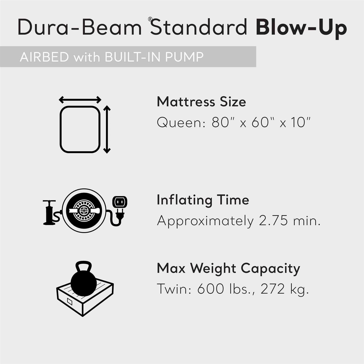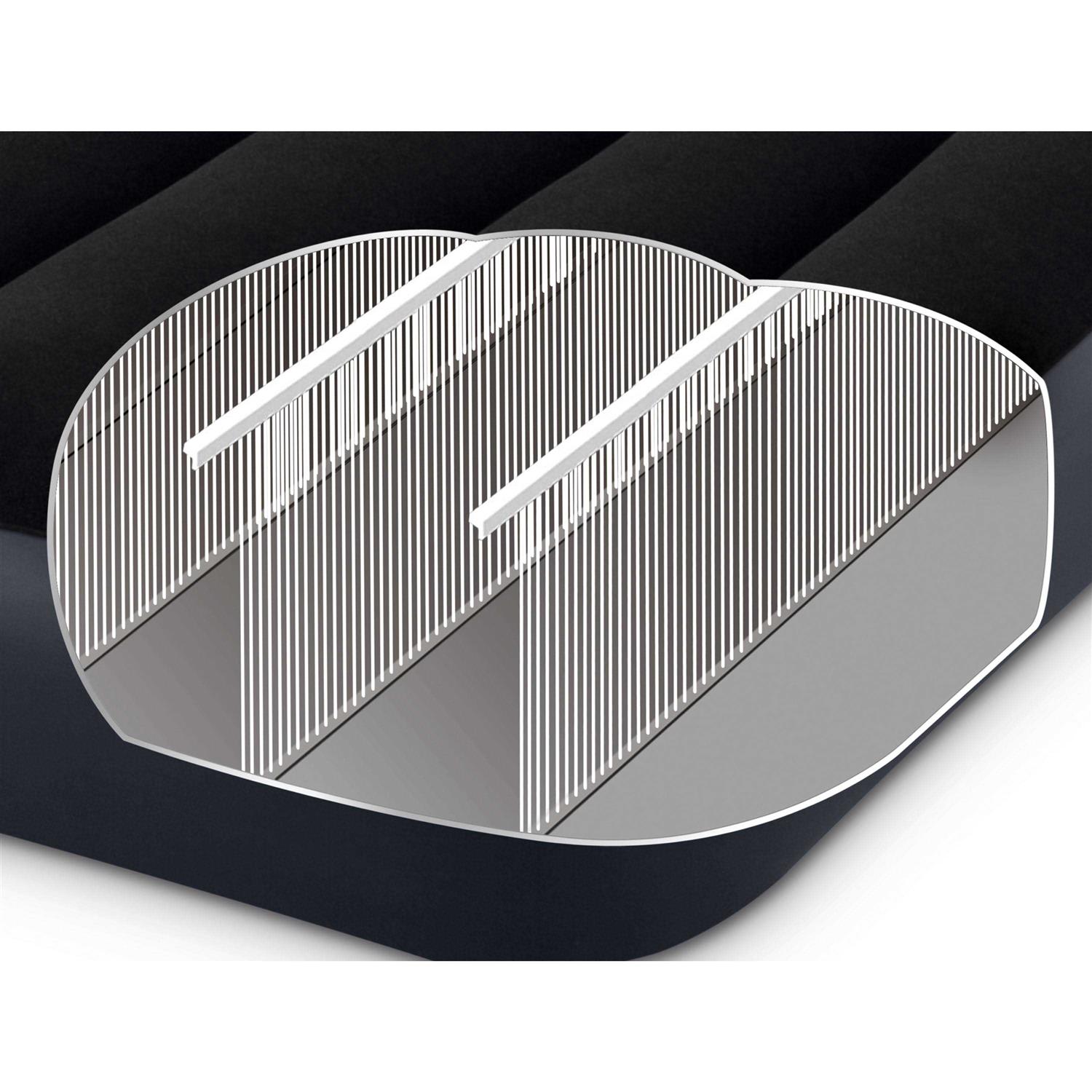 Covered in a velvety sleeping surface and enhanced with Fiber-Tech interior construction for lasting durability and comfort, this compact and lightweight Intex Pillow Rest Classic Air Mattress with Fiber-Tech IP is built for great sleep anywhere you go. This air mattress features a built in pillow and includes a carry bag. A built in pump inflates the queen size air mattress in only 4 minutes! Queen size air mattress is raised 10 in. from the floor for convenience. Built-in pillow for added support and bed-like comfort. Approximate inflated air mattress size: 60 in. x 80 in. x 10 in. Approximate inflation time is 2-1/4 minutes. Max weight limit 600 lb. Never place an infant 15 months and young to sleep on an inflatable mattress. When used by children over 15 months old provide at least a shoulder width space between other objects to avoid entrapment.