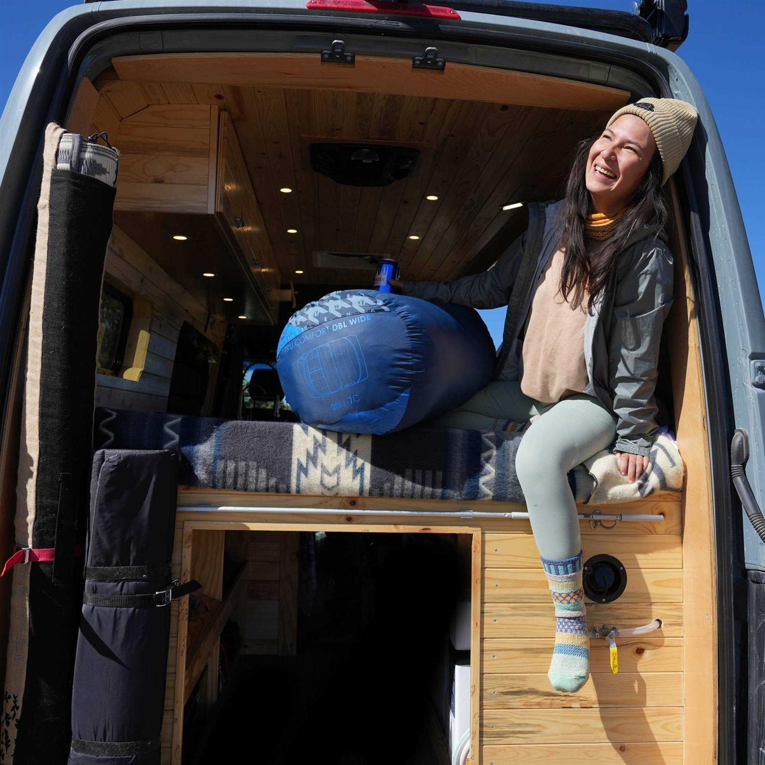 The Kelty Tru.Comfort Doublewide 20 Degree was designed with couples in mind. Its oversized hood and spacious interior allow plenty of room for two and it’s even equipped with internal blankets that yield flexible temperature regulation options for 2-person, 3-season camping. This bag is insulated with Kelty’s CloudLoft, a synthetic insulation that is easy to care for and maintains its loft, and hence its insulating properties, over time. Less expensive than down, synthetic insulation also retains most of its insulating capabilities when wet, making the bag a good choice for adventures in wet or damp climates. Both the shell of the sleeping bag and the lining are made of 75 denier polyester taffeta. Where the bag really stands out from others is in its layered design. Underneath the outer layer is a built-in blanket which provides unrivaled flexibility. The blanket bolsters warmth when temperatures dip but can serve as your sole top cover when the mercury rises. The bag’s two-way zipper also creates venting options. This comfy bag also features a zip-off top layer for reducing weight and warmth. A stuff sack is included. The Kelty Tru.Comfort Doublewide 20 Degree sleeping bag fits up to 6′ 6”.