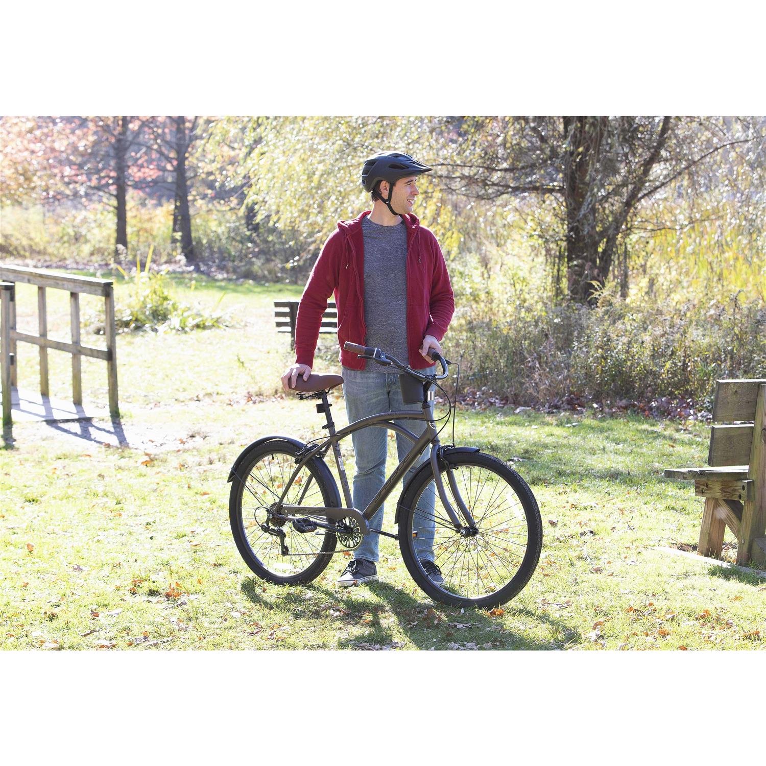 The Kent 26 inch Bayside men’s cruiser bike is a hot rod cruiser that looks fast while it’s standing still. It features a navy-blue cantilevered steel frame, sweet black rims, fenders, and swept-back handlebars. It also has a stylish brown seat and brown grips to add to the classic look of this bike. The seven-speed drivetrain with an easy twist shifter and a Shimano rear derailleur adds functionality to this bike making it easier to handle hilly areas. The front and rear alloy side pull handbrakes on this men’s 26 inch bike keep it under control, while the comfy springer style saddle is ideal for longer adventures. The seat height is quickly adjusted with no tools, courtesy of the quick-release seat post clamp. This bike also has a cup holder for added convenience.
