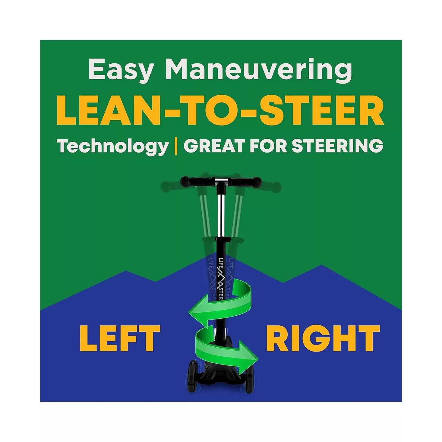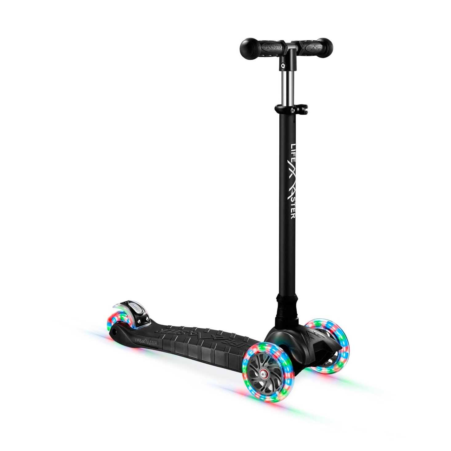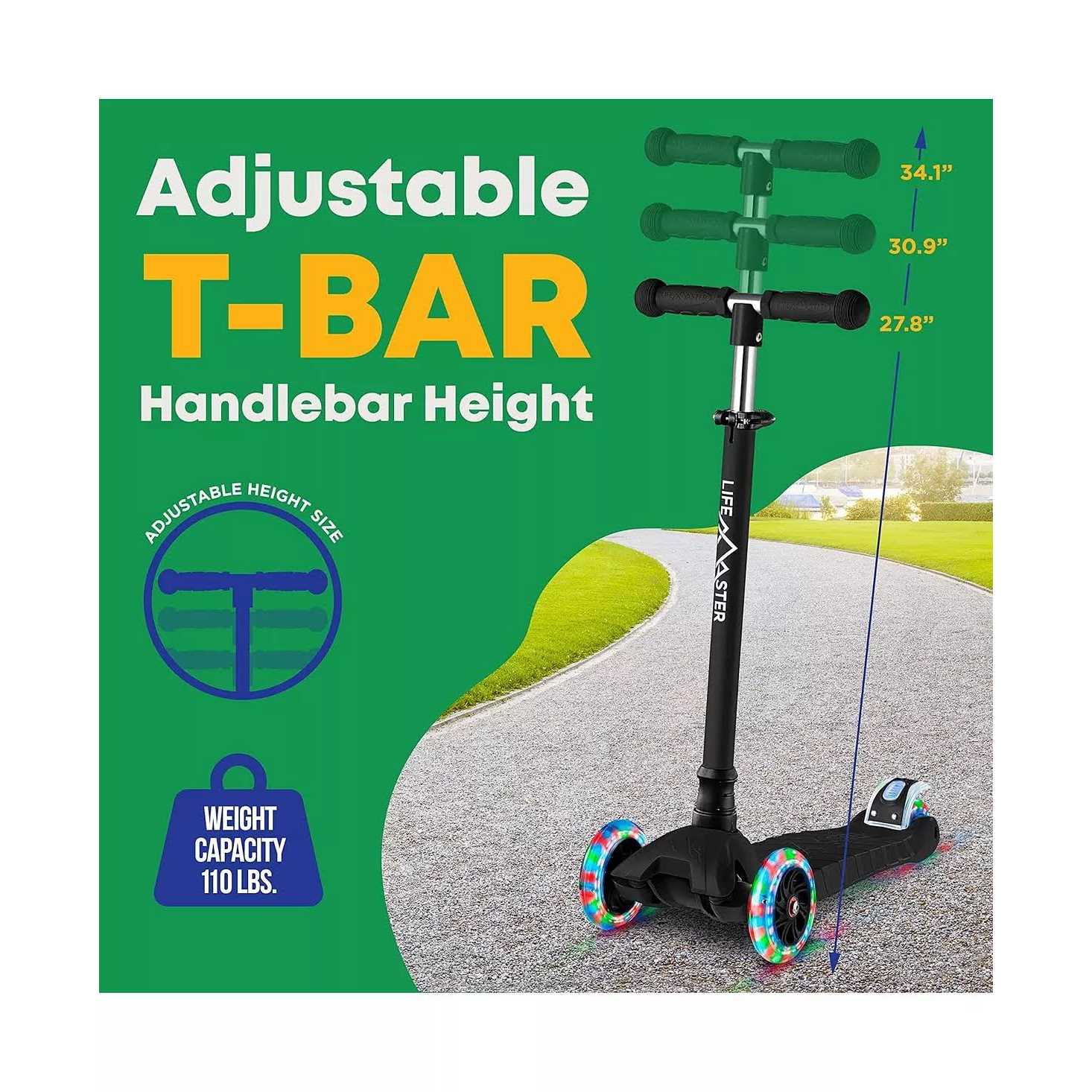 Kick Scooters by Lifemaster. Details:Color : Black Handlebar Height Setting: Adjustable 27.8/30.9/34.1(inches) Wheel Size Diameter: 120mm x 30 Front, 80mm x 24 Rear Construction Material: Aluminum Metal, Engineered PP Wheel Type / Wheel Material: Engineered Polyurethane Recommended Age: 1 Year and Up Weight Capacity: Up to 110 lbs. (Seat Capacity: 44 lbs.) Open Scooter Size (L x W x H):22.44 ”x11.42”x34.1” Lightweight, compact and portable, our 3 wheel scooter with light up wheels is great for days out and vacations plus it can also be easily stored in the garage or basement when not in use. There are so many opportunities where your child can enjoy the freedom of without a heavy, bulky scooter weighing you all down. A great gift Perfect for toddlers and young children from 1 to 8 years of age. Our scooter offers a traditional standing usability which is both comfortable and practical when at the park, out with friends, playing in the backyard and on vacation! Whether you want to…