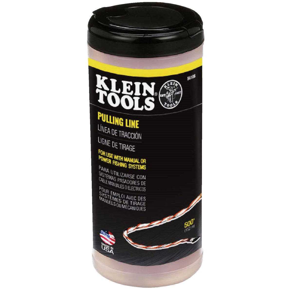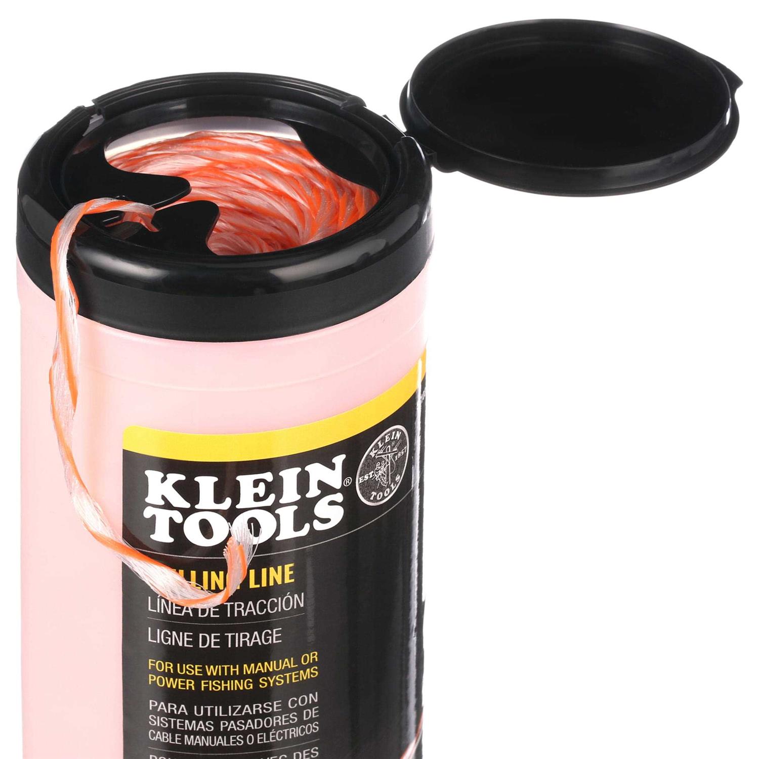 Use the Klein Tools 500-foot (152.4 m) Pulling Line with manual or power fishing systems in pulling light-duty cables or rope pulling applications. The line comes in a compact container that easily dispenses without tangles and snags. This pull line features a 210-pound (95.3 kg) average breaking strength.