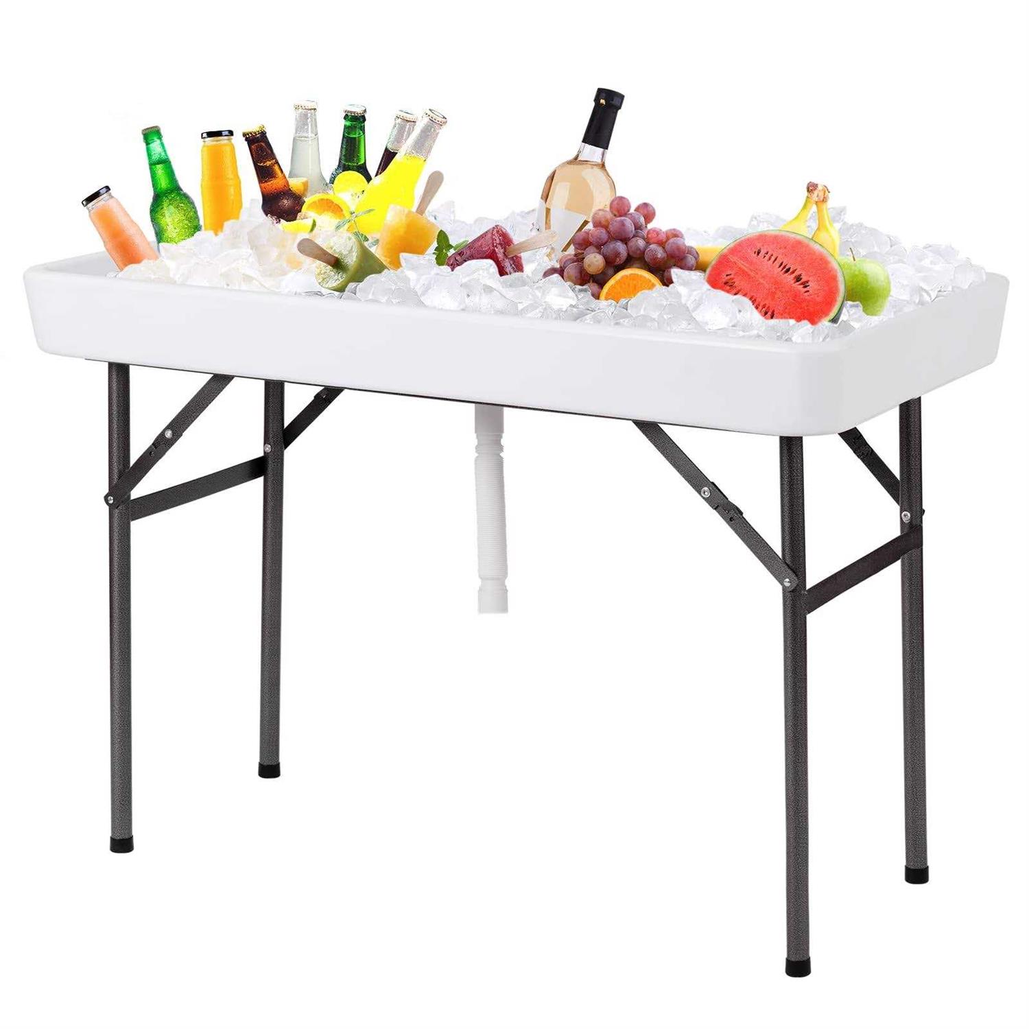 Brand: KOTEK KOTEK Folding Ice Cooler Table with Matching Skirt & Drain Plug, Foldable Beverage Cooler Table Buffet Cooler Server, Portable Chill Table for Party, Picnic, BBQ, Camping Features: 【Space-saving Table】Th legs can be folded under the tabletop, it’s convenient to store the the table and it saves space for your home. 【Easy to Clean】The ice cooler table is designed with a drain hole and equipped with a drain hose, so it’s convenient to drain water and clean the table. 【Stable Structure】The table top is crafted of high-quality and long-lasting polyethylene which is solid enough to last for many years. Four legs are made of solid iron with exquisite finish and they are rust-resistant. 【Decorative Skirt】The ice table comes with a white skirt which brings a good look to the table. The skirt is movable and washable. 【Suitable for Various Occasions】This ice cooler table is perfect for a variety of activities such as weddings, parties, picnics, or sporting events. It can cool your food, fruit, drinks and make them keep fresh. Details: Description: This folding ice table is a great helper to keep your food and drinks cold during the party. The tabletop is made of high-quality and long-lasting polyethylene, the legs are made of solid iron. This table is sturdy and durable enough to last for many years. It’s designed with a drain hole and equipped with a drain hose, so it’s convenient to drain water and clean the table. This ice cooler table is perfect for parties, weddings, picnics or camping. Features: * Folding design for saving space * Lightweight and durable plastic tabletop * Power-coated legs are rust-resistant * Equipped with a drain hose for easy cleaning * Comes with a decorative skirt * Suitable for outdoor and indoor use * Easy to assemble Specifications: Color: White Material of Tabletop: Polyethylene Material of Legs: Iron Overall Dimension: 47.5” x 24” x 32.5” (L x W x H) Weight Capacity: 440 lbs Net weight: 24 lbs Package Include: 1 x Ice Table 1 x Skirt EAN: 0608564856257 Package Dimensions: 52.0 x 28.5 x 6.0 inches