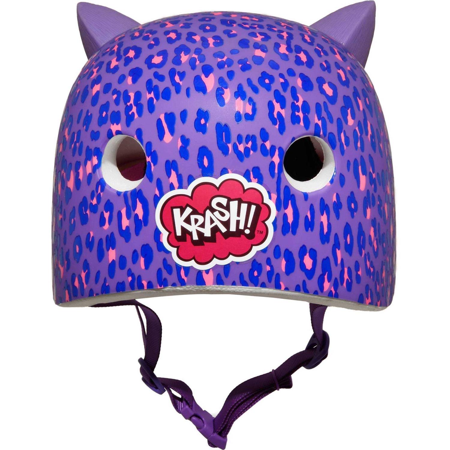 Purr down the streets in style with this fun Krash! Leopard Kitty 3D multisport helmet. The gloss purple and pink leopard print on a matte purple base gives this bike helmet a subtle and fashion-forward look. The purple 3D rubber kitty ears have a pop of bright pink on the front to round out the kitty look. Designed for use on trails, sidewalks and skate parks. Recommended for riders 8–14 years old, but will fit most with heads measuring 54–58 cm.
