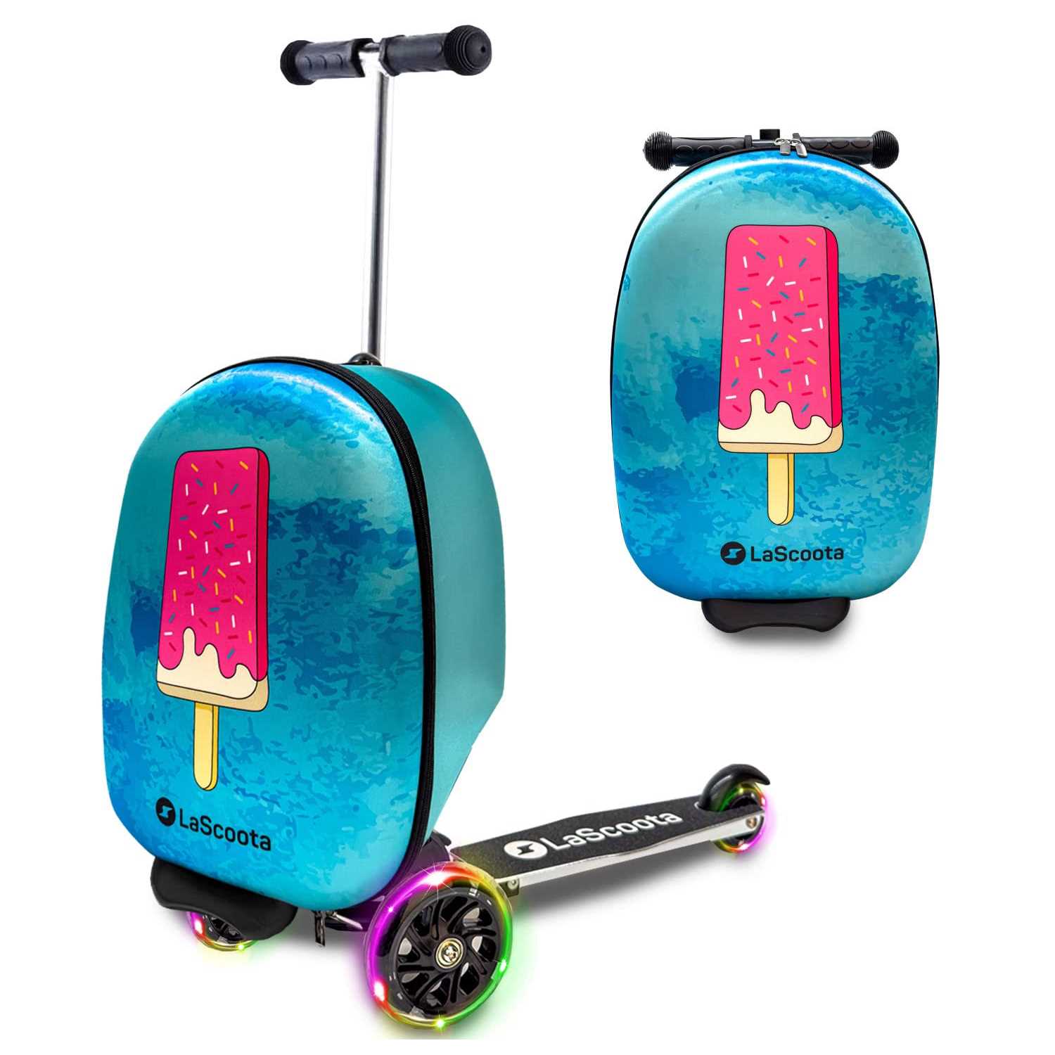 LaScoota Scooter Suitcase, Foldable Scooter Luggage for Kids – Lightweight Kids Ride On Luggage Scooter with Wheels, LED Lights – Ice Cream Graphic