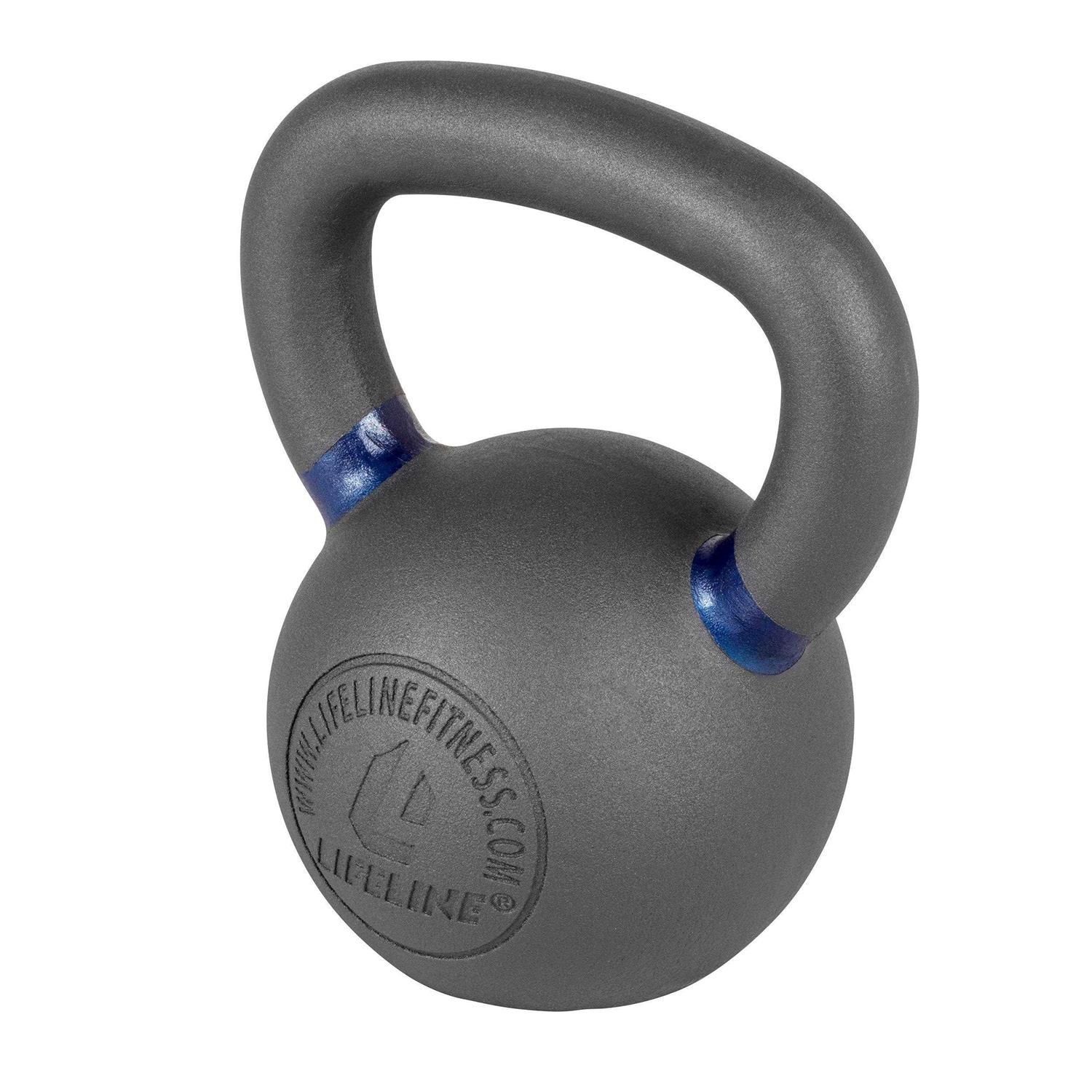 Lifeline Kettlebells are manufactured with first run/virgin iron ore not scrap and are formed into a strong balanced single-piece casting with a flat wobble-free base. A clean consistent surface and durable powder-coat finish gives Lifeline Kettlebells premium level quality. Kettlebell workouts deliver functional whole-body fitness by combining the burn of cardio with muscle building strength training and compound movements that deliver greater flexibility and coordination. Featuring the classic design popularized in Russia a few hundred years ago which allows them to be employed in countless waysincluding swings presses rows twists squats and snatches these kettlebells are weighted off-centered which recruits more stabilizer muscles and works the targeted muscles through a wider range of motion.
