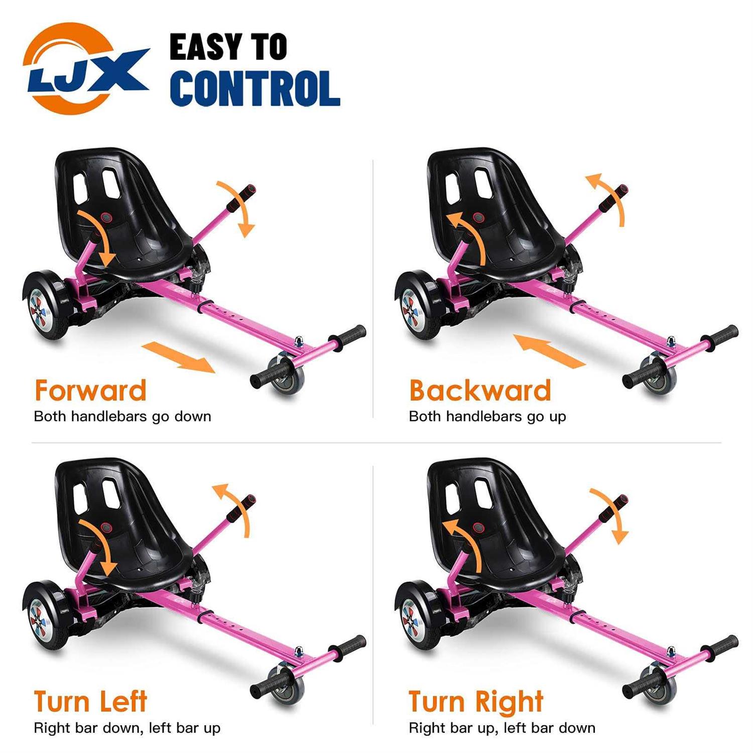 SAFER & MORE FUN:Transform your hoverboard into a fun go-kart. This LJX hoverboard seat attachment makes Hoverboard safer than standing on a hoverboard! No more falling from the unstable standing position. ADJUSTABLE & EASY TO INSTALL: Adjustable frame length to suit children and adults, wider seat makes more comfortable, Adjustable straps to securely attach hoverboard seat to the hoverboard. There are all necessary tools, four straps and concise instructions with our hoverboard seat attachment. You can assemble quickly in 5 minutes or less. EASY TO CONTROL: Two hands full control handles to accelerate, brake and turn left / right, and foot pedal controls direction. Hand-operation of the hoverboard kart gives you full control, makes you have more funny memory with your hoverboard. COMPATIBILITY: Fit most 6.5,8,10 inch hoverboards, Hoverboards which have handle in the middle are not Compatible. If your kids play the hoverboard kart, don’t forget to wear protective equipment and helmet before each riding. Let the balancing scooter create new fun. If you have any problem, feel free to email us. LJX hoverboard go kart is a health and beneficial sport, it assist your children to work on their coordination, motor skills and physical quality while building kids confidence. Get away from TV and digital games. This hoverboard seat attachment is a great creative gift and a good friend who will accompany children to grow up. 360° Flexible Wheel & Solid Tire: The free and flexible front wheel makes a variety of stunts and bring more fun. The tire in the middle of the hoverkart is durable enough to adapt to different road conditions. Durable Frame & Wider Seat: Aerospace-grade aluminum alloy material improve the stability of frame greatly. Our bigger seats make the players’ experience more comfortable and safe. Hoverboard seat attachment makes hoverboard instantly become a fashionable hoverkart. Easy to Assemble: There are four extra straps to prevent loss. Easily strap to most hoverboard. Safe design makes children more fun. Feature: Full Control Lightweight & Durable Adjustable leg pedals lengths Easy to master & install Suitable for 6.5, 8,10 inch hoverboard (Not Included) Product Use Guide: The Bracket of Karts should touch the pedal of Balancing Scooter well. If don’t touch very well, hoverkart would not engage the Balancing Scooter to move. Ensure that all the screws and nut on the karts are tightly secured before each riding. Wear protective equipment and helmet before each riding. Avoid obstacles, dirts, stones. Use this kart only on flat and clean surface. Avoid collision.