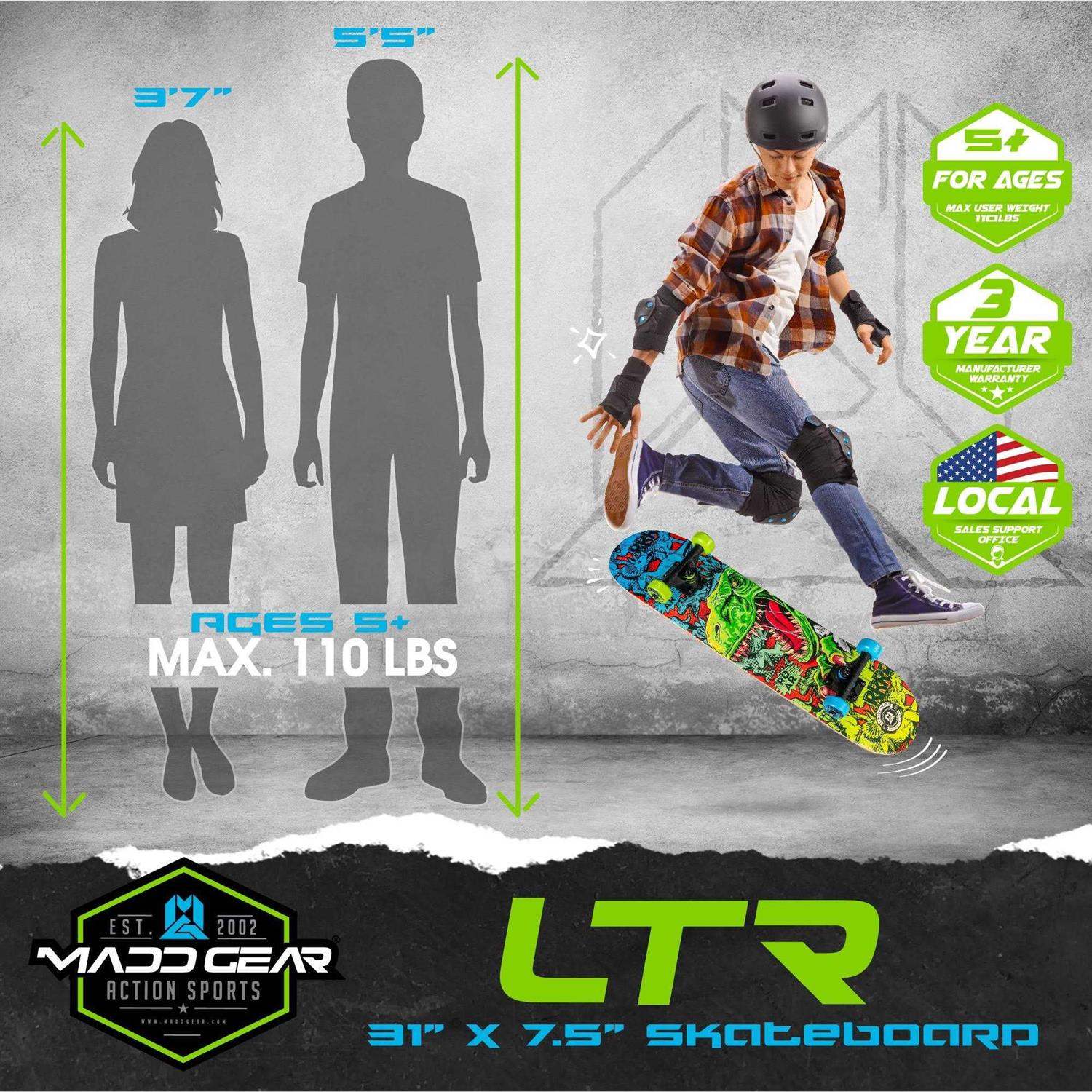 Madd Gear Double Kicktail Beginner Complete Skateboard with 9 Ply Standard Maple Deck – 31 x 7 in