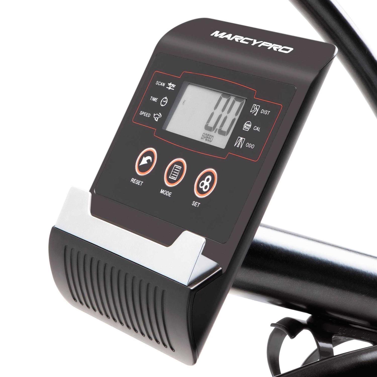 The Marcy Pro Recumbent Bike includes handle bars which move back and forth much like an elliptical. Using the arm exercisers while pedaling will help you burn as many calories as possible during your ride! The recumbent bike seat is adjustable to best fit the users needs. The sliding track to adjust the seat is chrome to make adjusting the seat as easy and smooth as possible. Make progress by tracking your progress with the included LCD Display. The LCD Computer displays time speed distance calories and odometer total distance. The Marcy Pro Recumbent Bike comes with a high density foam padded seat and back pad. This extra comfort allows you to stay comfortable even on long bike rides. Keep your favorite drink at arms length during your workout using the convenient water bottle holder located below the LCD monitor.