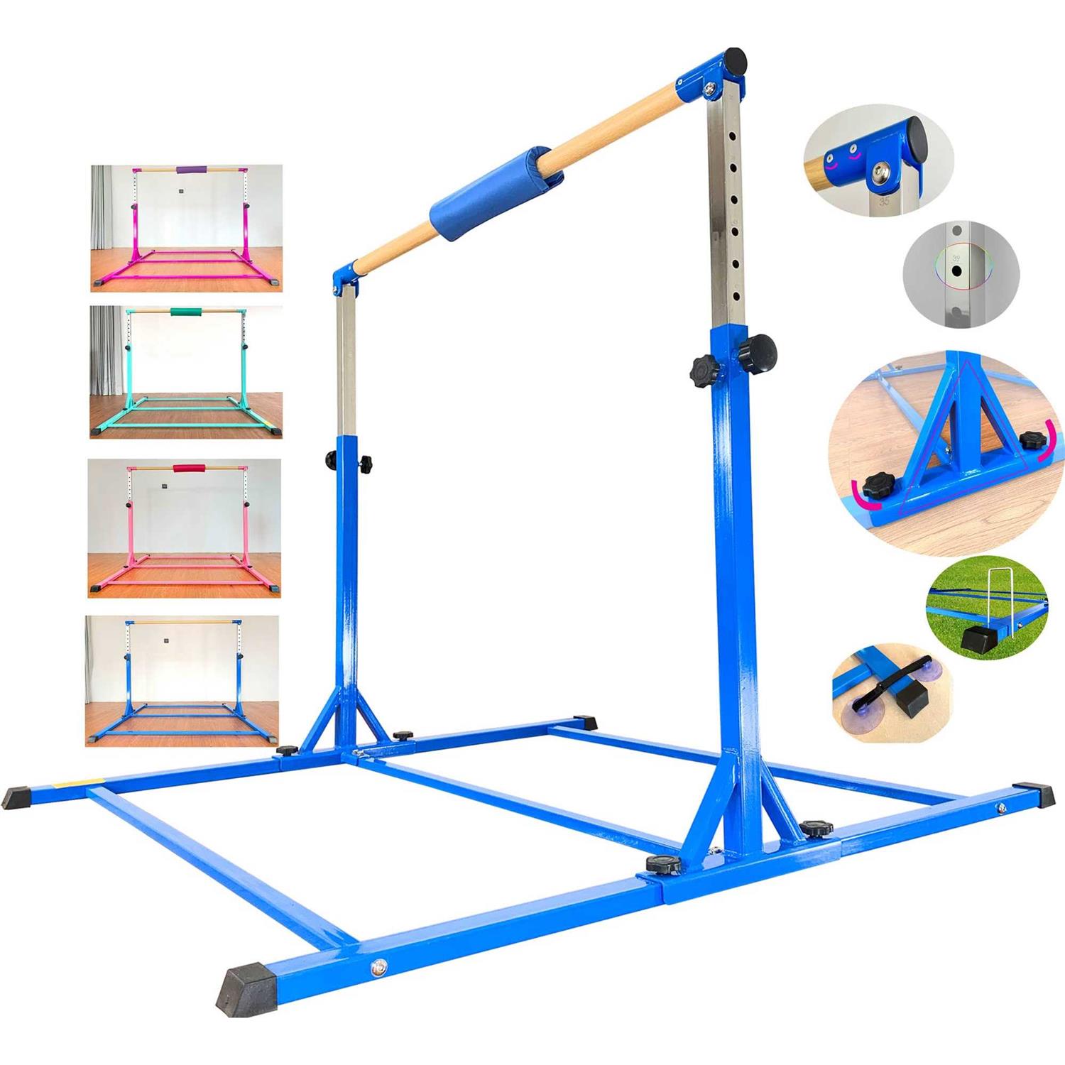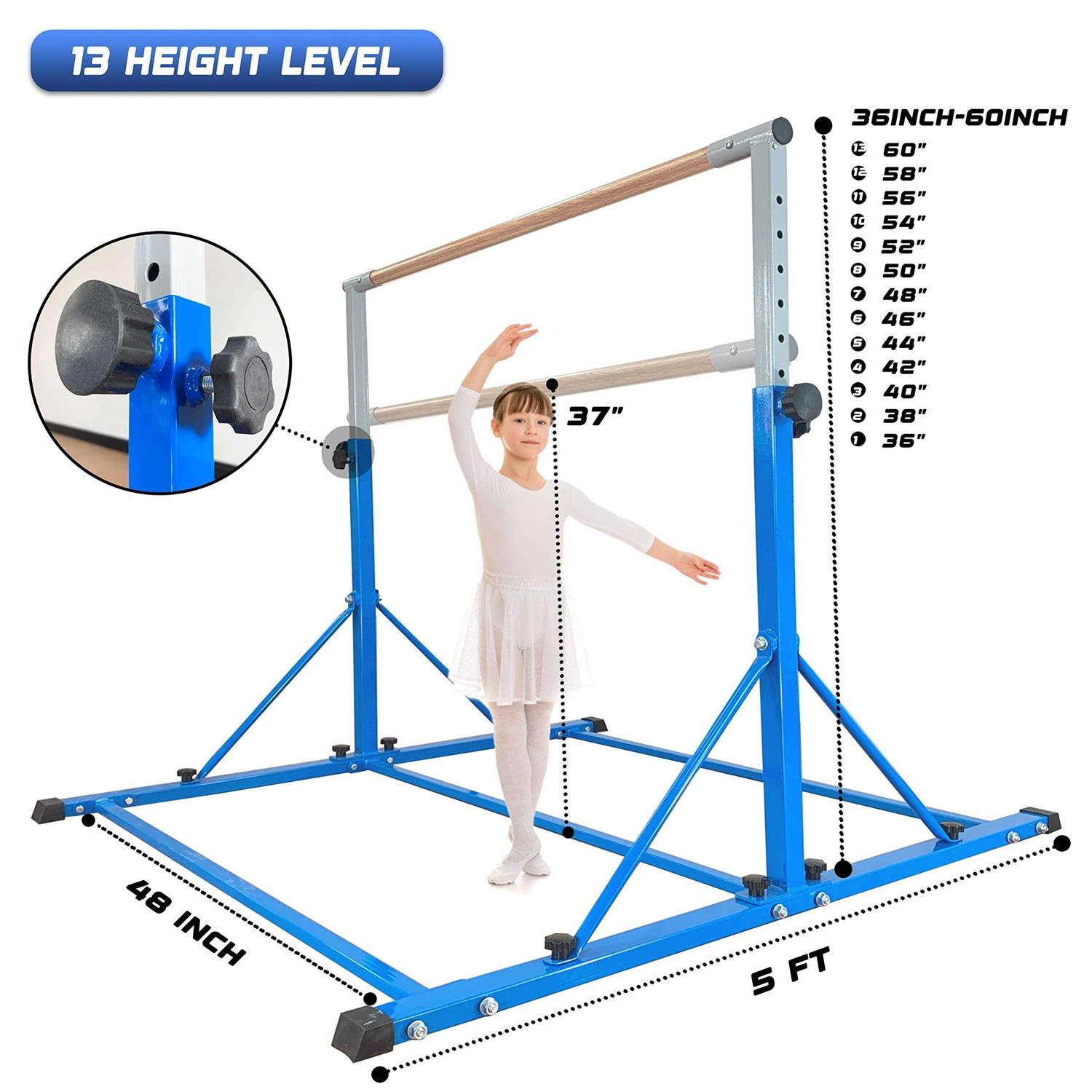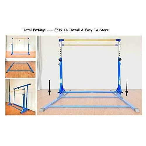 【IT IS ONE PROFESSIONAL GRADE GYMNASTICS BAR】 This gymnastic bar is one professional grade kip bar for kids and teenage between 3 – 20 years old, weight capacity is up to 350 lbs. Big triangle structure improve overall stability. And handle design on base makes bar easy to assemble and disassemble. When you do not use it, you can disassemble it and put them against wall or under the bed, and when you are on holiday, you can carry it with you. 【IT IS ONE SAFE GYMNASTICS BAR – PERFECT MATERIAL】 ※Crossbar is made of fiberglass with wood cover, compared with other material, it is more Strong and Durable and Flexible, and give kids professional feeling as competition. ※Adjustable Pole and frame are made of Strong Heavy Duty Steel, this material make the gymnastic bar more heavier and improve overall stability and safety. ※All round Welded, more safe. 【IT IS ONE IDEAL SIZE Gymnastics Horizontal Bar For Kids Home and Gymnastic Center】This type of gymnastic training bar set is designed for kids and teenage who hope to improve their gymnastics levels. Length is 5 Ft, width is 4ft, height is adjustable, 13 levels, from 36inch to 60inch, compared with 10 height levels bar, 13 height levels give kids more choices. The size is neither large nor small, ideal for home and gymnastic centre use.