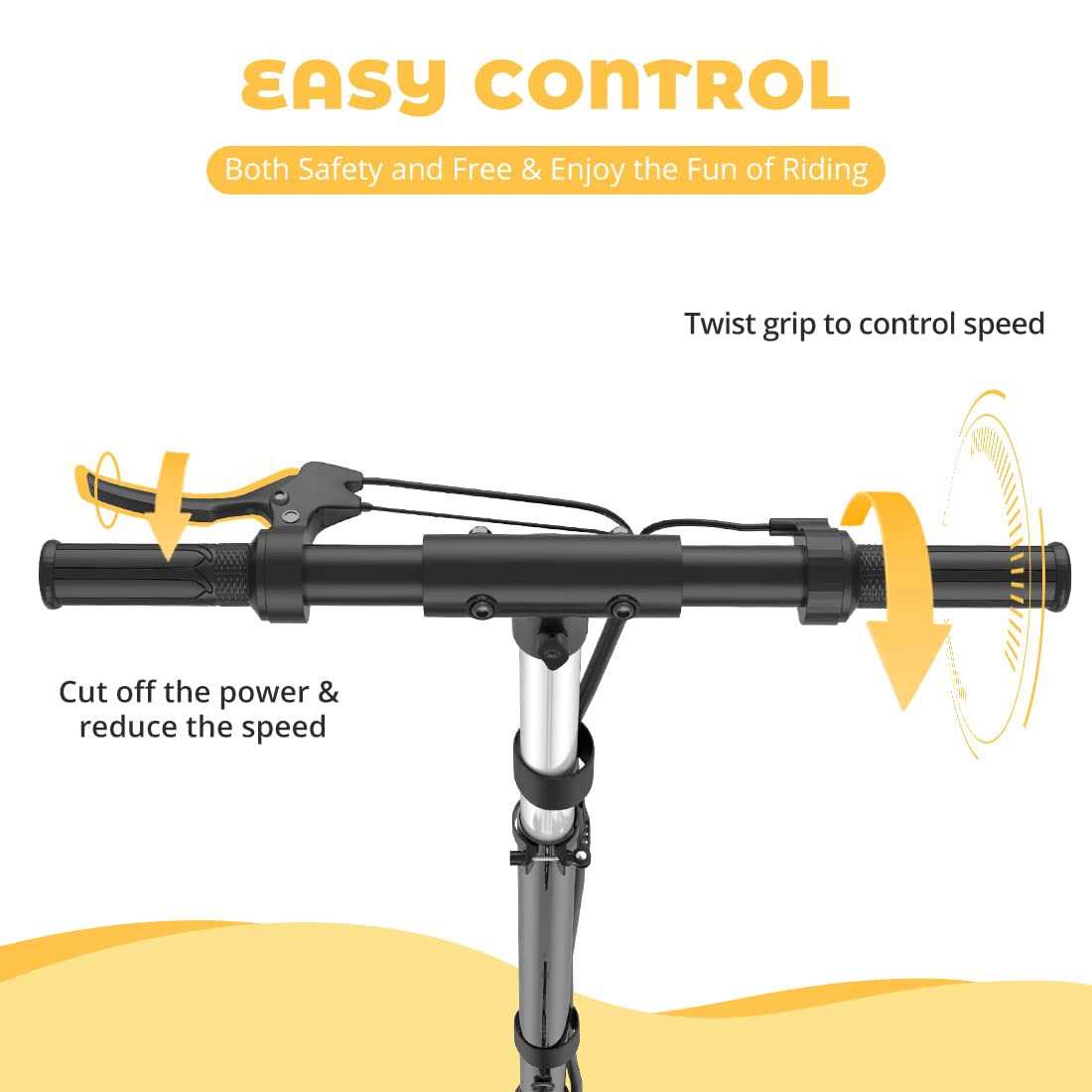 2 RIDING WAYS TO HAVE FUN: The fast removable seat will allow children to switch between scooter and mini bike and enjoy 2 different ways of riding READY TO ROLL: Rechargeable (Charger included) 24V batteries. Continuous running time after full charge up to 60 min. By twisting the throttle to control the speed, up to 10mph, No kick-start COMFORTABLE RIDING: The wider 8” deck makes it easier for children to step on. Soft seats and adjustable handlebars make riding more comfortable SAFE RIDING: E120 kids scooter is equipped with 6 “solid tires on both front and rear, no flat tires, no maintenance.Hand operated rear brake, easy to operate, smooth stop FOLDABLE & PORTABLE: E120 e scooter has a lightweight stainless steel body that is durable and portable. The folding design folds easily in 3 seconds and can be easily placed in the trunk IDEA GIFT FOR KIDS: MAXTRA kids electric scooter is perfect for children ages from 6-12 years old.