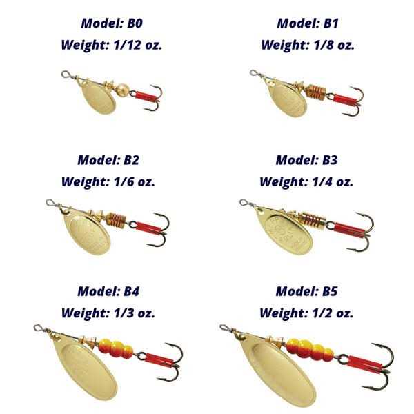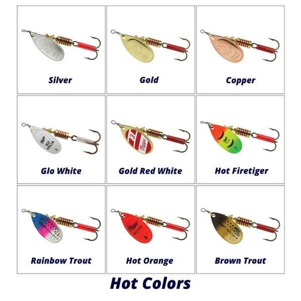 Mepps plain treble or single hook Aglia in size #00 or #0 are perfect for pan fish (bluegills or sunfish) and small stream trout. They are very light, however, and require a nimble rod, equipped with a light action reel spooled with light line; nothing heavier than six-pound-test. Two-pound-test to four-pound-test is better. Aglia in size #1 and #2 are perfect for larger stream trout and large bluegills, sunfish and crappies. Size #2 Aglia are also excellent for smallmouth bass and walleye. These sizes are ideal for teaching youngsters the basics of spinner fishing, as they are heavy enough to cast well with light tackle, yet they are small enough to catch a wide variety of fish. Size #4 and #5 Aglia are ideal for large rainbow trout and steelhead, as well as Coho (silver) and chinook (king) salmon. Mepps single hook Aglia can be used virtually anywhere single hook lures are required. They are perfect for Alaska.