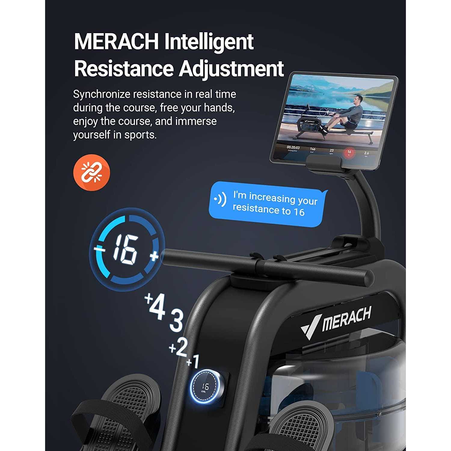 The MERACH R06 is a dual water and magnetic resistance rowing machine designed to provide a professional rowing experience. It features 16 levels of automatic resistance adjustment, enhancing your workouts. Its ergonomic design ensures optimal comfort, and it is built with high-quality materials, capable of supporting users up to 350 lbs. Connect the Free MERACH APP to enhance your sports experience.