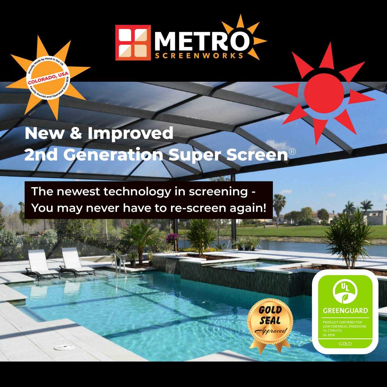 Vinyl coated polyester You May Never Rescreen Again – With its advanced screening technology, Super Screen window mesh screen lasts much longer than standard rolls of screen, which often succumb to rips and brittleness. Clear-View Screening Material – Designed specifically for pool enclosures and screened-in patios or porches, our 17/20 Tiny Mesh screen offers maximum protection and durability with the clearest view. Pet Resistant Window Screen – Super Screen pet screens’ long-lasting durability and tear strength makes it the ideal choice for those looking for a catio or dog-resistant screen. Three Different Screen Mesh Counts – This pet resistant screen comes in three different screen mesh counts based on your needs — standard 17/14, 17/20 Tiny Mesh, and 20/20 no-see-um screen. Greenguard Gold Certified – Super Screen is lead free, phthalate free and meets all “Green Guard Gold” safety standards, ensuring our products are free from harmful volatile organic compounds and safe for you and your family A rip resistant screen, Super Screen is the best porch screening solution to keep you from having to replace your screening due to weather or pet damage while still maintaining a clear view. This pet resistant screen comes in three different screen mesh counts — 17/14, 17/20 Tiny Mesh, and 20/20 no-see-um screen — and widths from 24 inches to 126 inches, making it the perfect enclosure screen roll for your porch, patio, or lanai screen replacement. The Tiny Mesh roll’s true 17/20 mesh means every square inch contains 17 lines of horizontal screen woven with 20 lines of vertical screen, making it almost impossible for even the thinnest debris to get through. With a durable tear strength 300 percent greater than that of fiberglass window mesh screen, the Super Screen pet screen roll will make your window screen pet resistant, and its long lasting screen mesh roll keeps it from breaking down in direct sunlight and heat, helping your screen to retain its color and “new screen look” for years to come. Don’t believe us? Make Super Screen your window screen replacement, and you may never have to rescreen again! Super Screen’s heavy duty screen door mesh easily installs like standard screening into doors, windows, patios, porches, and screen enclosures of all types. Over 40 years in business, Metro Screenworks is the trusted nationwide leader in custom window screens, screen doors, pet screen, screening for porches, and everything in between. All of our screens are manufactured in the USA.