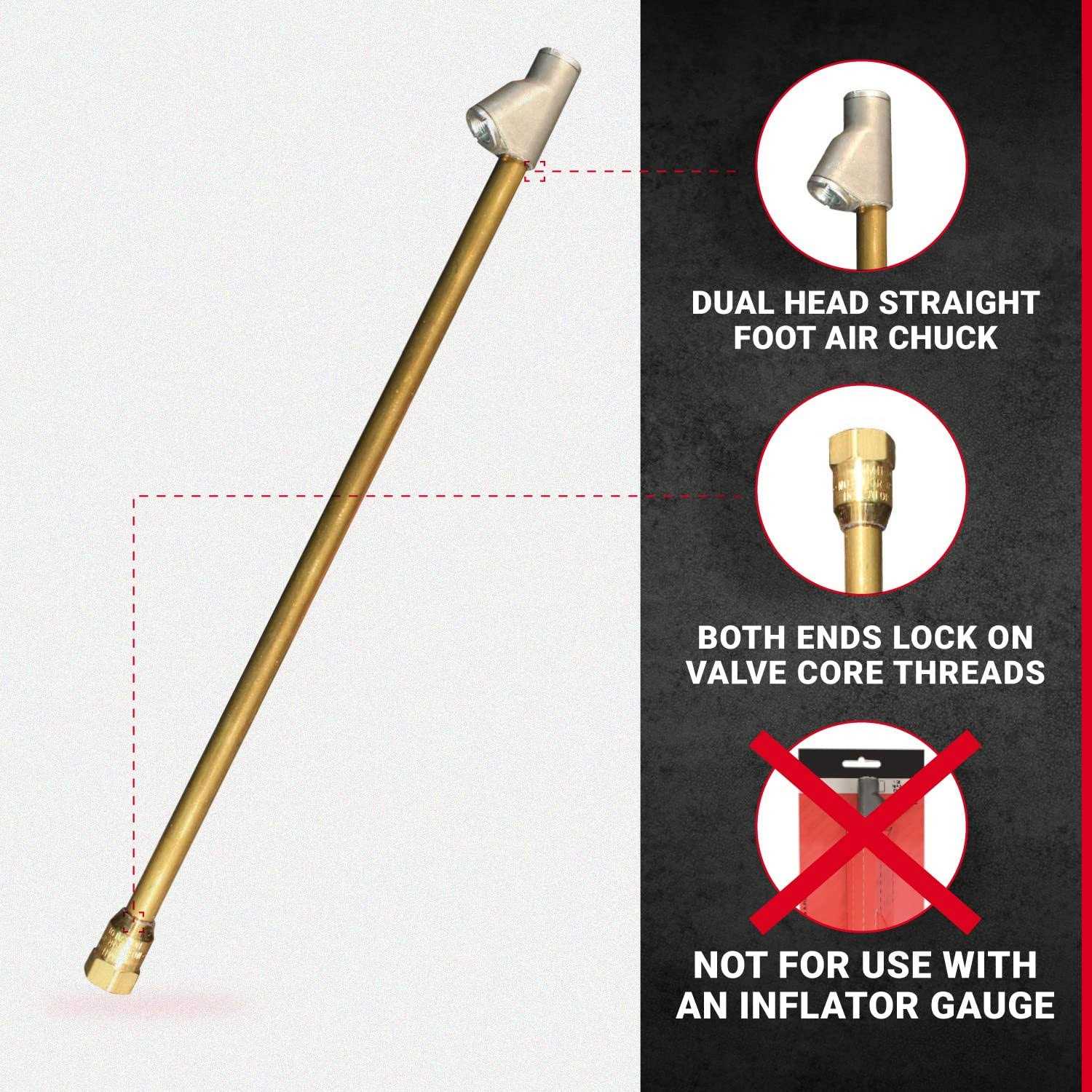 Extended reach dual head straight foot air chuck for inner duals has is designed and manufactured to exacting standards. The extra reach of 12″ is great for inflating the inner duals. Sealing type chuck is closed and is for use on an airline. With a cushioned grip handle this air chuck also locks onto tire valve thread. Not for use with an inflator gage. Maximum pressure of 150 PSI.