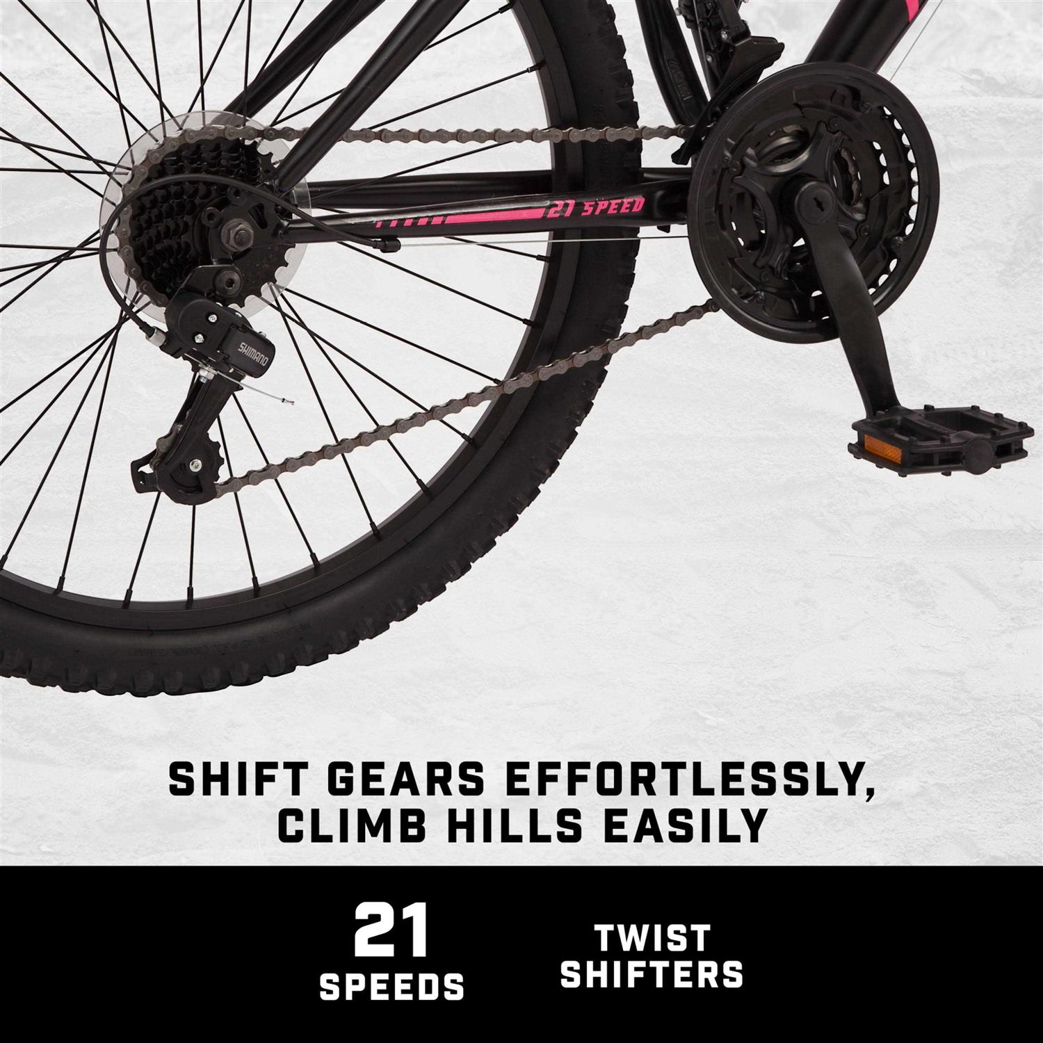 Mongoose Excursion mountain bike, 24-inch wheels, 21 speeds, girls frame, black Take on steep slopes and tough trails with glee on the Excursion Mountain Bike from Mongoose. Made for experienced mountain bikers and new riders alike, this hardtail mountain bike is built with a durable steel mountain frame and front suspension fork that are designed to take the abuse of bumps and dips found on dirt paths and trails. 21-speed twist shifters and the Shimano rear derailleur offer complete control over resistance and speed while traveling, giving you a wide gear range and letting you fine-tune your ride as you go. The Excursion benefits from light and strong alloy rims that help lighten the load and knobby mountain tires that dig into dirt, sand or grass on your toughest rides. Slowing down to a halt, even on a steep hill, is simple thanks to the front disc and rear V-brakes. There’s nothing you can’t do on a Mongoose. Since 1974 Steel mountain frame with suspension fork to smooth bumps and increase control on the trail. 21-speed with twist shifters and Shimano rear derailleur for precise gear changes. Front disc and rear V-brakes provide fast, controlled stops. This bike comes unassembled.