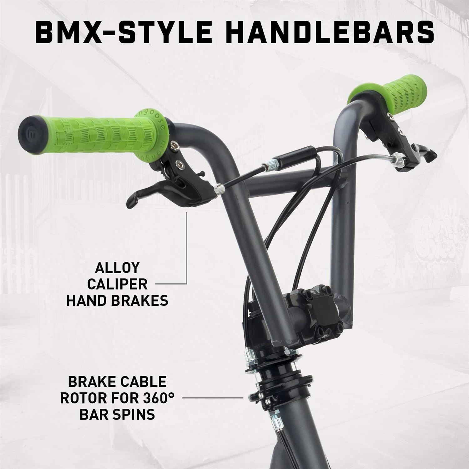 - BMX bike style handle bars and hand brakes are easy to stop and build confidences, Also freestyle handlebar rotor and axle pegs