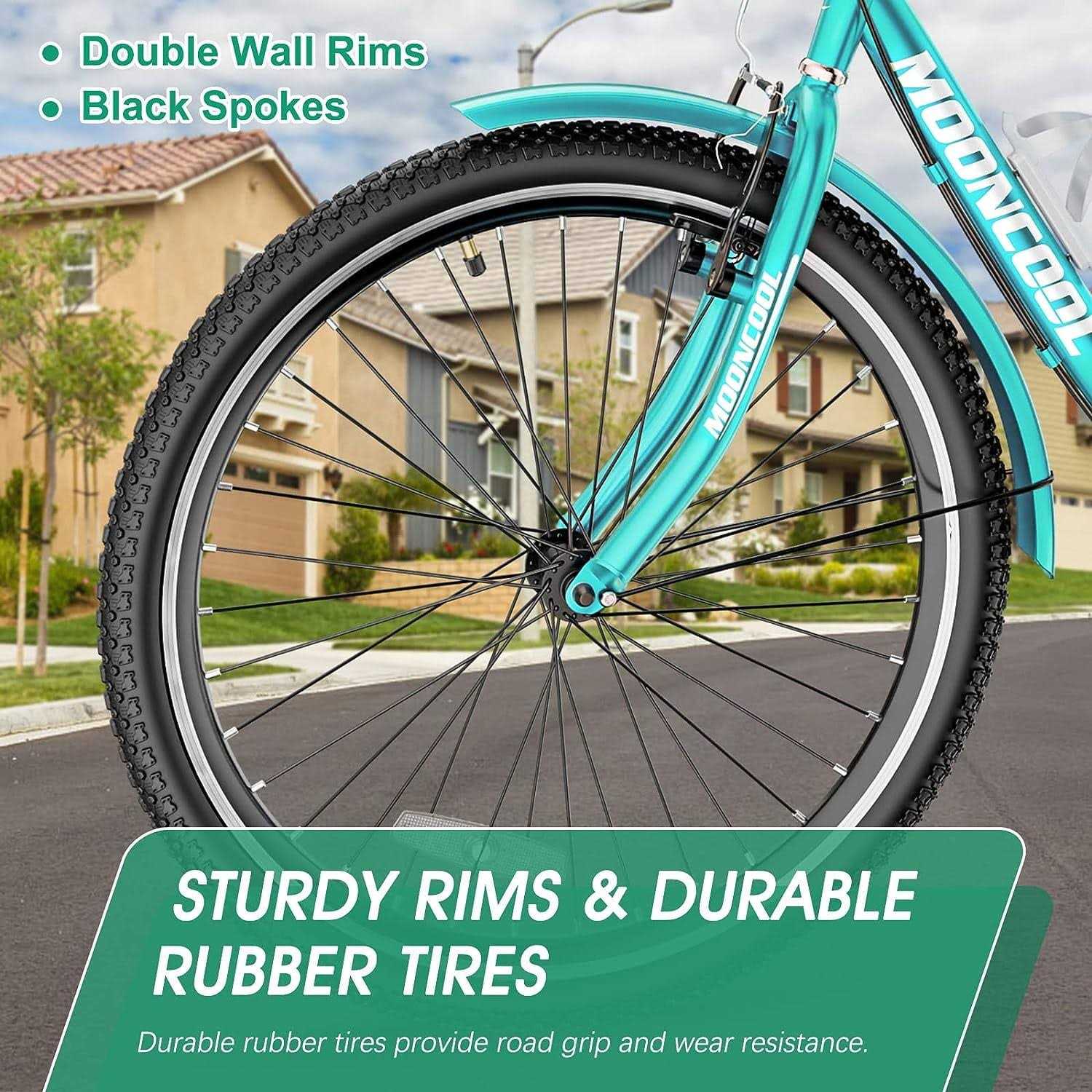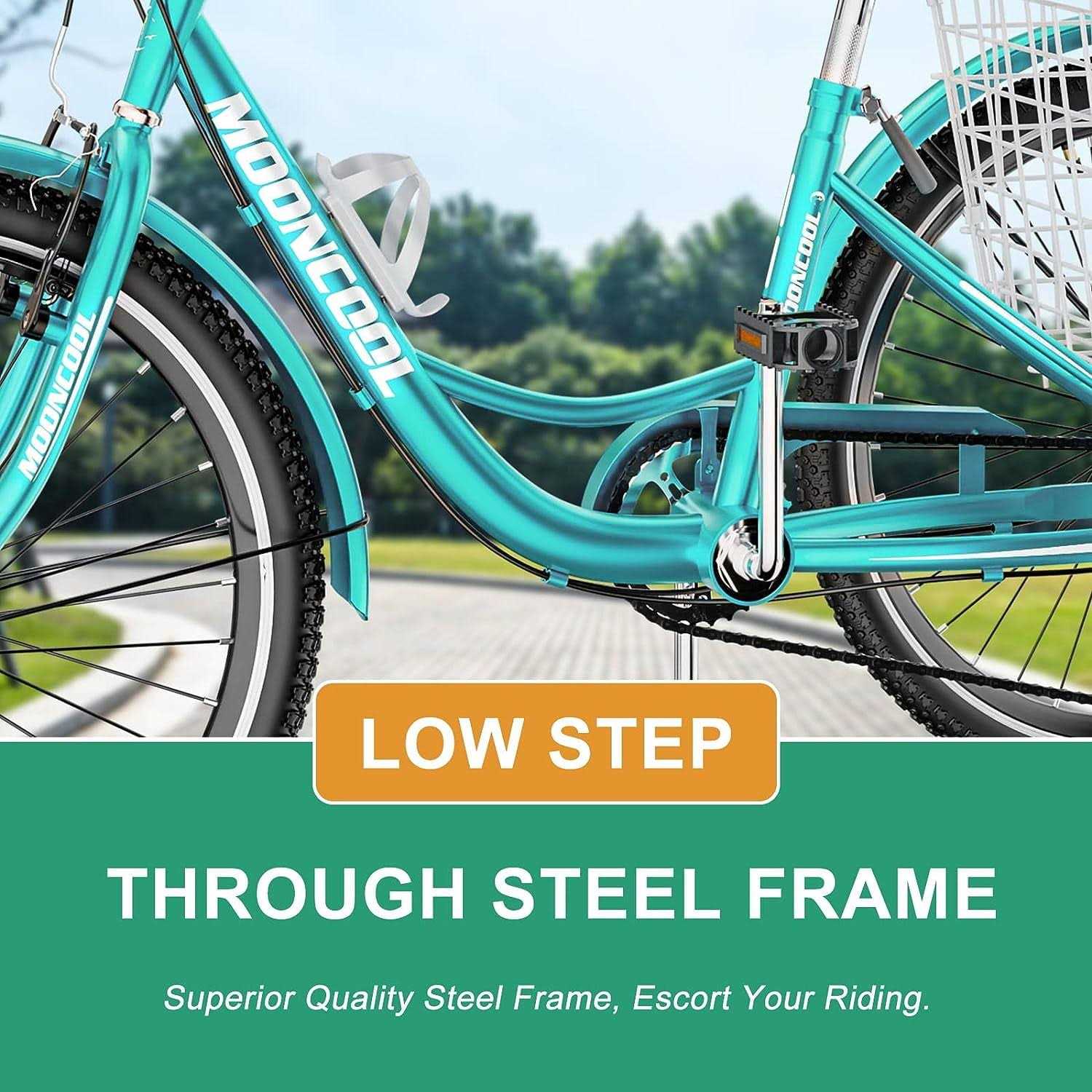 MOONCOOL Adult tricycle for seniors, women, men. 24 inch wheel suitable for rider height: 4’11 inch – 5’10 inch. The adult tricycle has a large rear basket, which are convenient for shopping and carrying enough thing as you want. Folding basket is also perfect for picnics or storing groceries. Soft padded seat with Backrest, it’s more comfortable. Our full-size tricycles are a great choice for people who want to enjoy an outdoor ride. It features a 7-speed drivetrain, front linear pull brake, and rear expander brake , creating an interesting riding experience.Our tricycles are made of high-quality iron and can support a total weight of 350 pounds for the rider and cargo. In addition to the practicality of the tricycle, the tricycle design ensures safe and stable driving, and the frame will remain strong and stable.