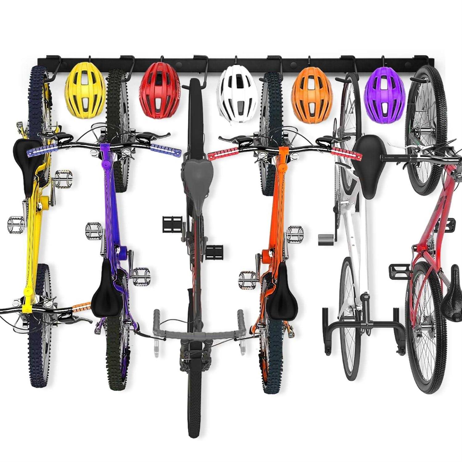 High Capacity: Organize up to 6 bikes and 300 pounds with perfectly sized spacing.Fits road, mountain, and kid bikes so you can easily store your gear assortment. Space Efficient: The Wall Bike rack’s super small footprint saves space by storing your bikes vertically. Ideal for an apartment, home, or garage. Heavy Duty: The sturdy safety hook design could ensure that your bike wall mount stable and will not release accidentally. Protective Hook: Each hook with EVA arm protector securely holds your bike wheel and protects scratches and scuffs. Easy to assemble: Easily assemble the bike storage rack in minutes with only a screwdriver. Hardware included.