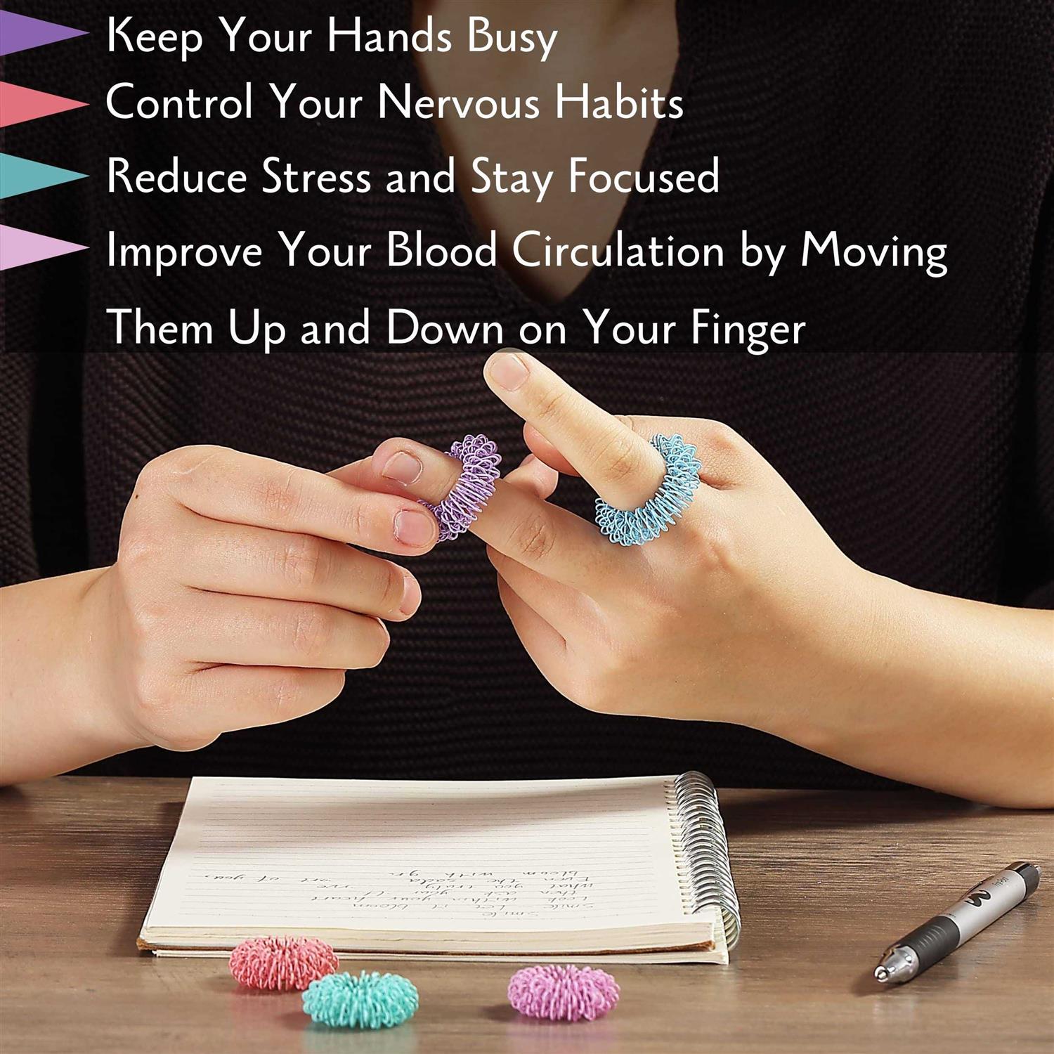 Do you want to channel your nervous energy into something productive, have fun and improve dexterity? With our spiky sensory rings, you will feel a satisfying feeling. Pen spiky sensory rings come with 10 pieces in 5 different colors, 2 pieces per color. Pen spiky sensory rings are made of high-quality stainless steel with an anodized coating to make them strong, durable, rust-proof, and not easy to fade. They help create plenty of pressure and sensation through the acupressure process. Our spiky sensory rings outer diameter is about 1 inch, and their inner diameter is 0.38 inch. The rings are flexible and suitable for everyone who likes to wear them on their fingers or toes. Pen spiky sensory rings will provide tactile stimulation and improve focus and concentration. Perfect for older youths, teens, and adults. They will also reduce anxiety, stress, and fidgeting while providing gentle acupressure when rolled back and forth along the fingers. These massaging rings can promote the blood circulation of the finger to a certain extent and are especially helpful for those with attention disorders, OCD, special needs, or high anxiety levels. Very suitable for students, office workers, and a generally perfect choice for everyone.