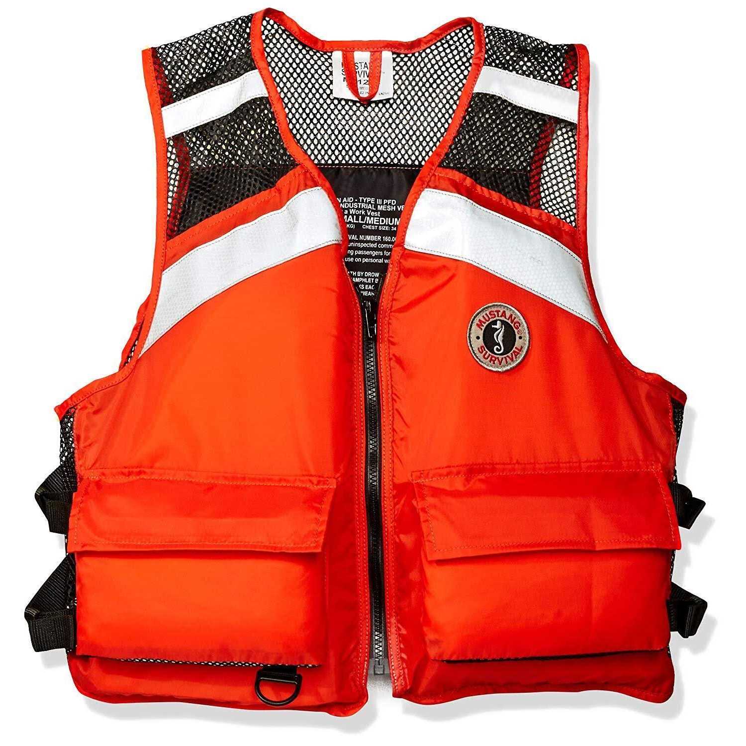 Mustang Survival’s industrial flotation vests are all USCG TYPE III approved and designed for maximum comfort and mobility on the job. The Industrial Mesh Vest offers maximum visibility, mobility, cooling and comfort with features such as large arm holes, mesh shoulders, and 32 square inches (206.5 sq. cm) of SOLAS reflective tape across the front and back of the vest. The Industrial Mesh Vest is also strength tested to 50MPH (80.5kph). Vest is recommended for use by industrial marine, law enforcement, public safety, sea, sea blue water and sea brown water. Vest has large front pockets with hook and loop closures for easy and fast access. Side adjustment and a full front zipper closure provide a custom fit. Vest is equipped with a D-ring for accessory attachment. High waist reduces interference with tools, duty belts, and side arms. Vest provides 15.5 lbs. (7 kg) of buoyancy as required by USCG Type III Approval.