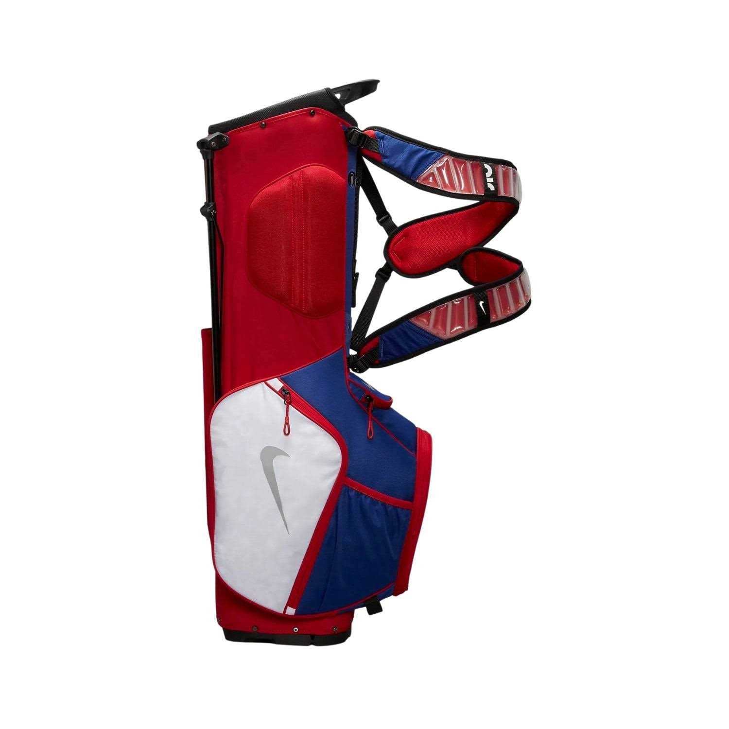 The Nike Air Sport 2 Stand Bag is equipped with an EquaFlex Max Air double strap system for comfortable hauling, and 9 functional pockets help keep essential equipment organised on the course. Featuring a 4-way divider for keeping your clubs in order and the Nike EquaFlex dual strap system with a ventilated air mesh back pad for extra comfort when carrying. A water resistant, fleece lined pocket protects your valuables, while an insulated cooler bottle pocket provides easy access storage for food and beverages, plus scorecard and pencil pockets to keep you organised. The Air Sport 2 now features utility webbing for convenience, new custom grip leg end caps for stability when standing and the matching rain hood is included for protection from the elements.