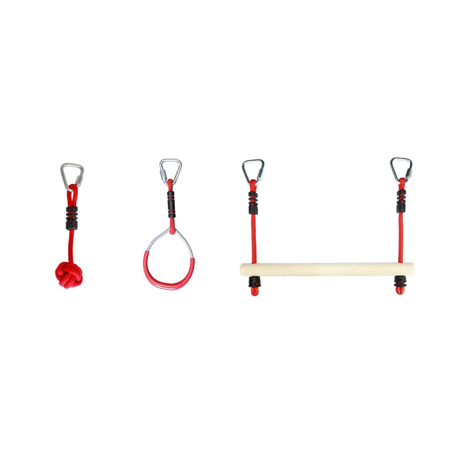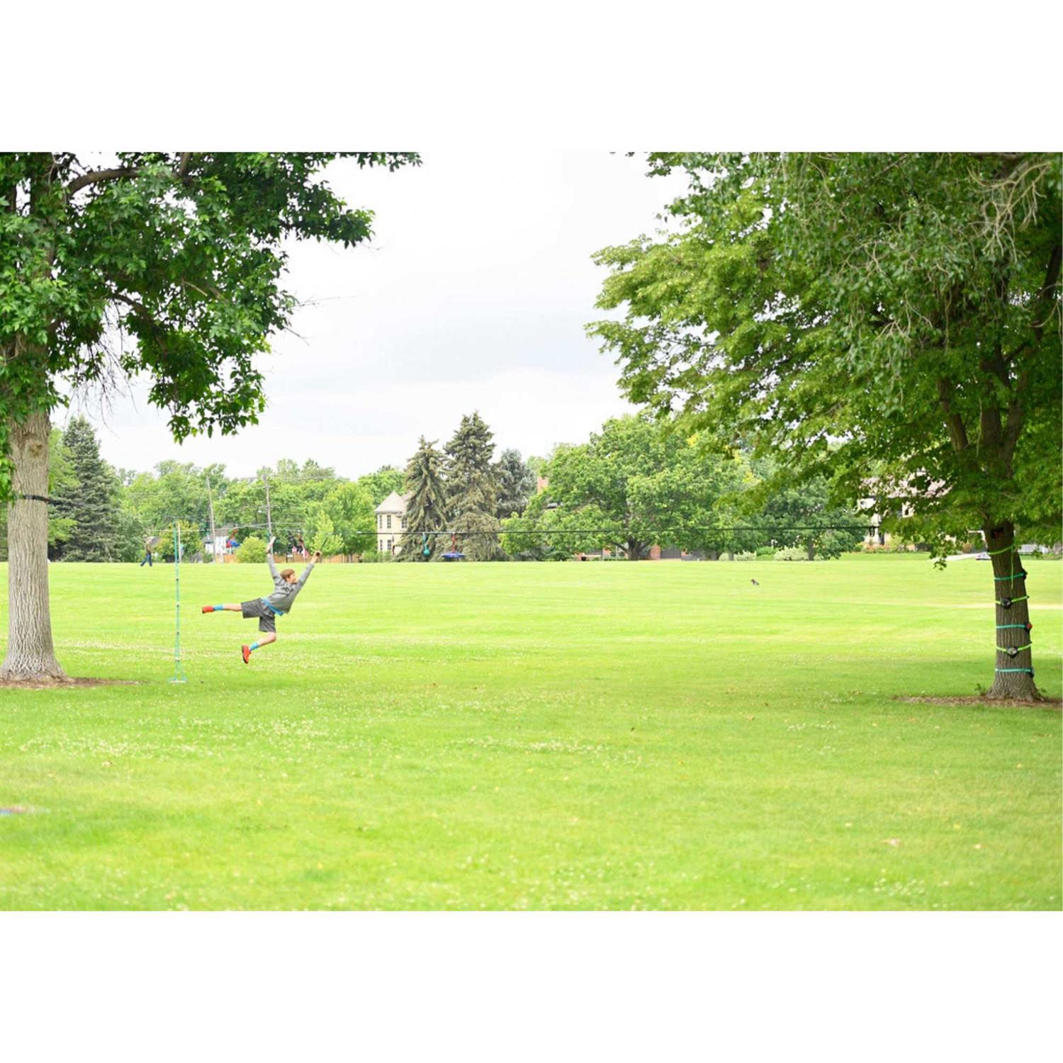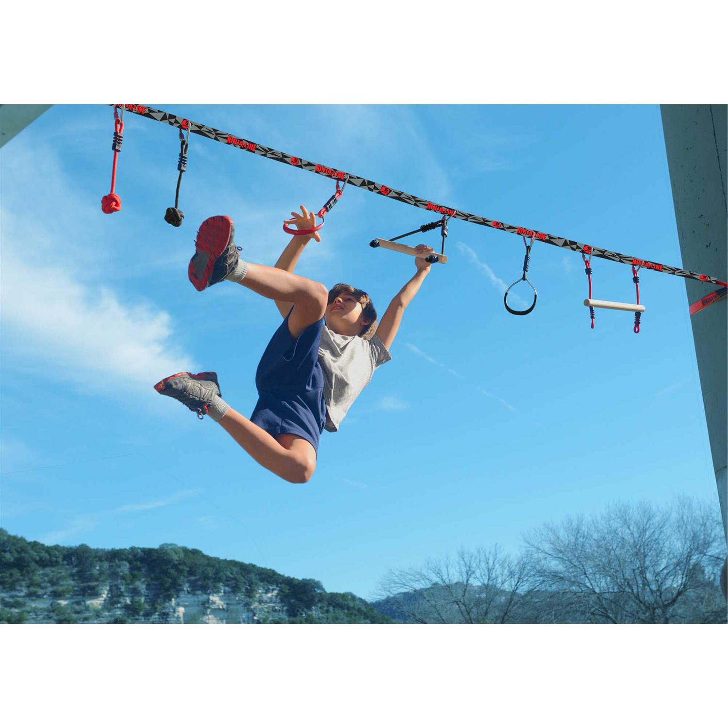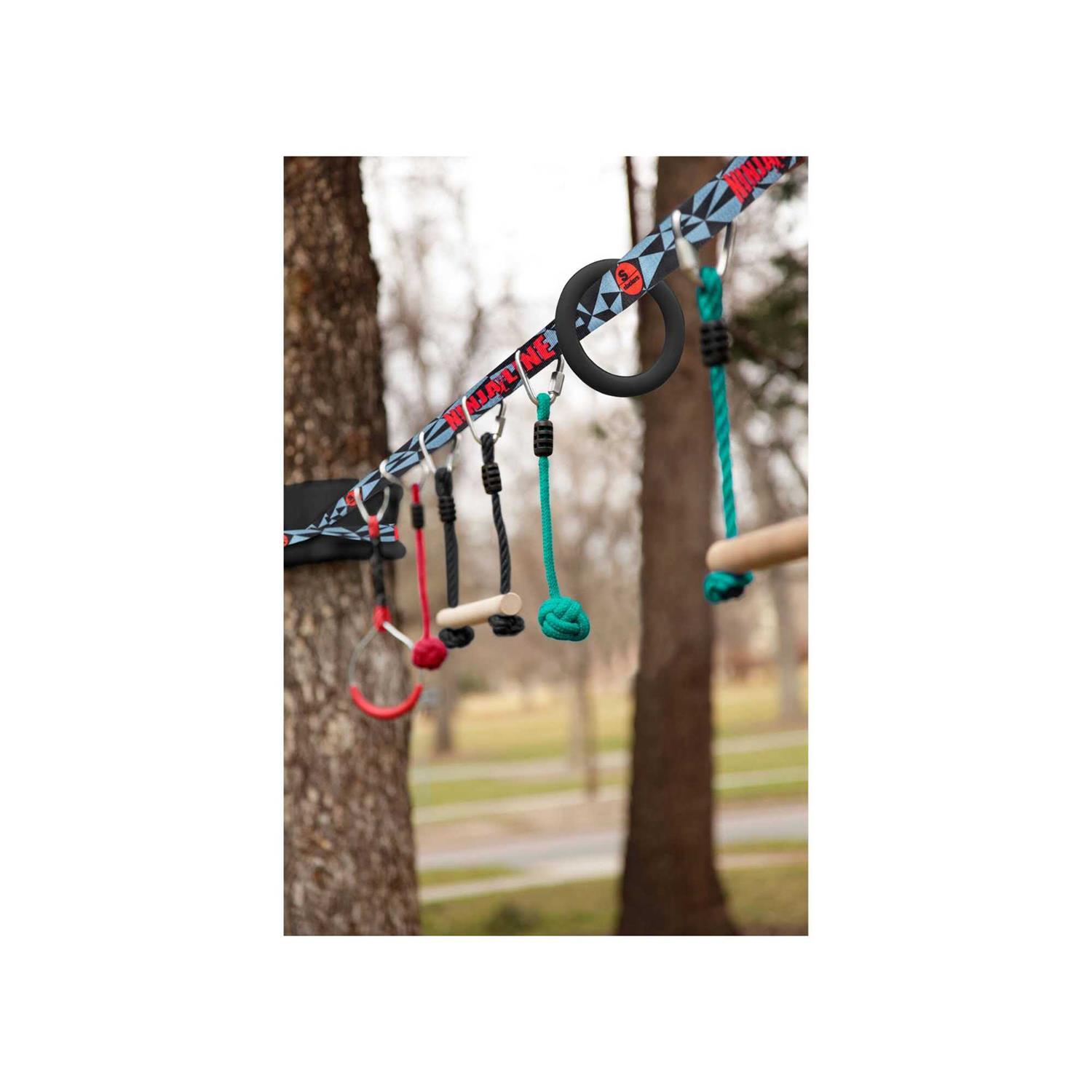 B4 Adventure Slackers NinjaLine 36′ Backyard Outdoor Hanging-Obstacle Intro Kit 7 hanging obstacles can be moved and reordered Slackline hangs between 2 posts or trees 14 pockets sewn into line allow you to space obstacles Reinforced steel ratchet Comes with storage book bag The B4 Adventure Slackers NinjaLine 36′ Backyard Outdoor Hanging-Obstacle Intro Kit lets you create your own obstacle course and outdoor gym. The starter pack is convenient and portable in the included bag so you can take it camping or to the park and set up your ninja-training course in minutes. Build core strength and confidence with 7 hanging obstacles that can be moved and reordered for endless patterns that match your skill level. Hang the 6000-lb.-rated professional slackline between 2 posts or trees and tighten using the reinforced steel ratchet with rubberized grip. 14 pockets sewn into the line allow you to space obstacles to vary the difficulty of your training course. The kit includes 3 10″L x 2.5″W nylon rope knots for grabbing 2 16″ birchwood monkey-bar holds with triangle carabiners 2 steel gym rings with ABS-textured finish and 1 36’L x 2″W professional slackline. All obstacles use 6000-lb. steel hanging delta safety clips with UV-resistant nylon rope and safety-buckle attachment. Can be customized with additional accessories not included. Intended for ages 5 and up with adult supervision. Imported. Wt. capacity: 250 lbs.