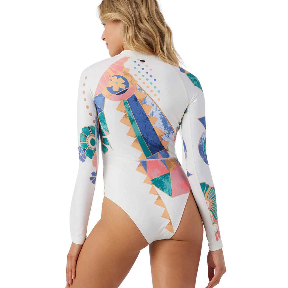 The O’Neill Jadia Floral Contadora Surf Suit offers the ideal combination of style and comfort. This Surf Suit features a long sleeve design, allover print, front zip closure, stretch fabrication and cheeky coverage. No underarm seam detail for paddle comfort. Ready for surf days.