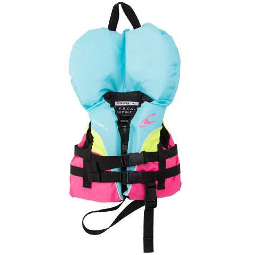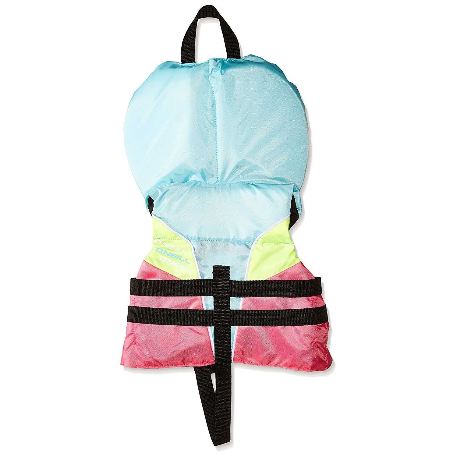 Weight limit fits: Up to 14kg. Head panel keeps head afloat and neck safely supported. Adjusts safely between the legs. Nylon coated shell. Closed cell PVC marine foam for a lightweight design. Three quick-release buckles for an easy on and off. Heavy duty front zipper. Logo at front left chest, front right hem, and on neck rest. 100% polyester. Hand wash cold, drip dry in the shade. Imported.