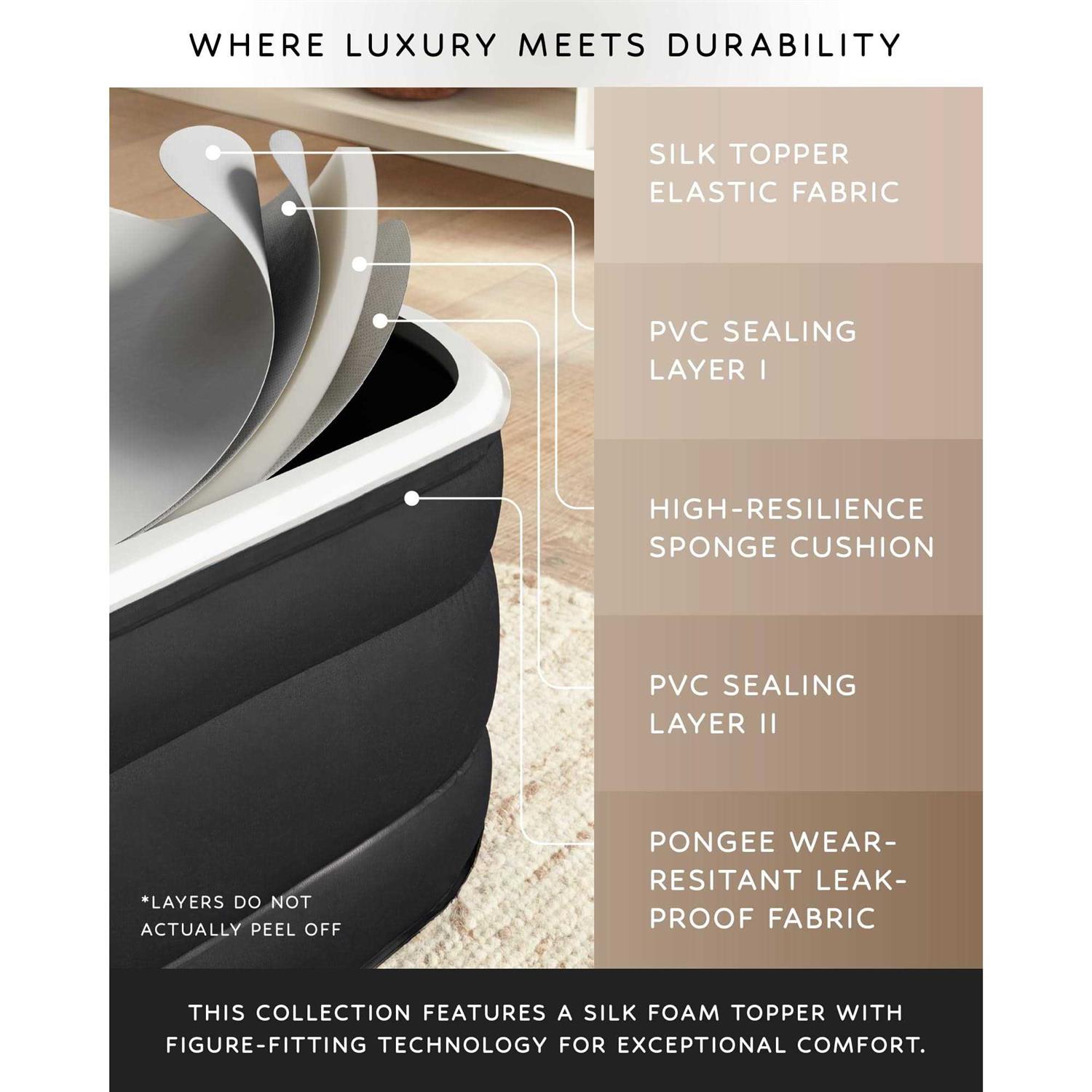Silky Smooth Foam Topper: Experience cloud-like comfort on our luxury air mattress with a silk foam top layer. This plush surface cradles you in luxurious softness, enhancing your sleep with a touch of elegance from Olarhike’s Signature Collection.. Crafted to last: Our air mattress boasts PVC coils for robust support, anti-leak fabric ensuring durability, and 50D milk silk fabric for added comfort. Rest easy knowing quality materials uphold your sleep experience.. Effortless comfort: Our air mattress features a built-in pump for easy self-inflation and deflation. Control your sleep environment with a touch, ensuring hassle-free adjustments and ultimate relaxation.. Experience tailored comfort: PVC coils gently conform to your body’s curves while you sleep. Our mattress embraces you with personalized support, promoting relaxation and rejuvenation night after night.. Seamless storage: Our air mattress offers a convenient solution with an included carrying bag. Deflate, roll up, and effortlessly stow it away, making transportation and tidy organization a breeze.