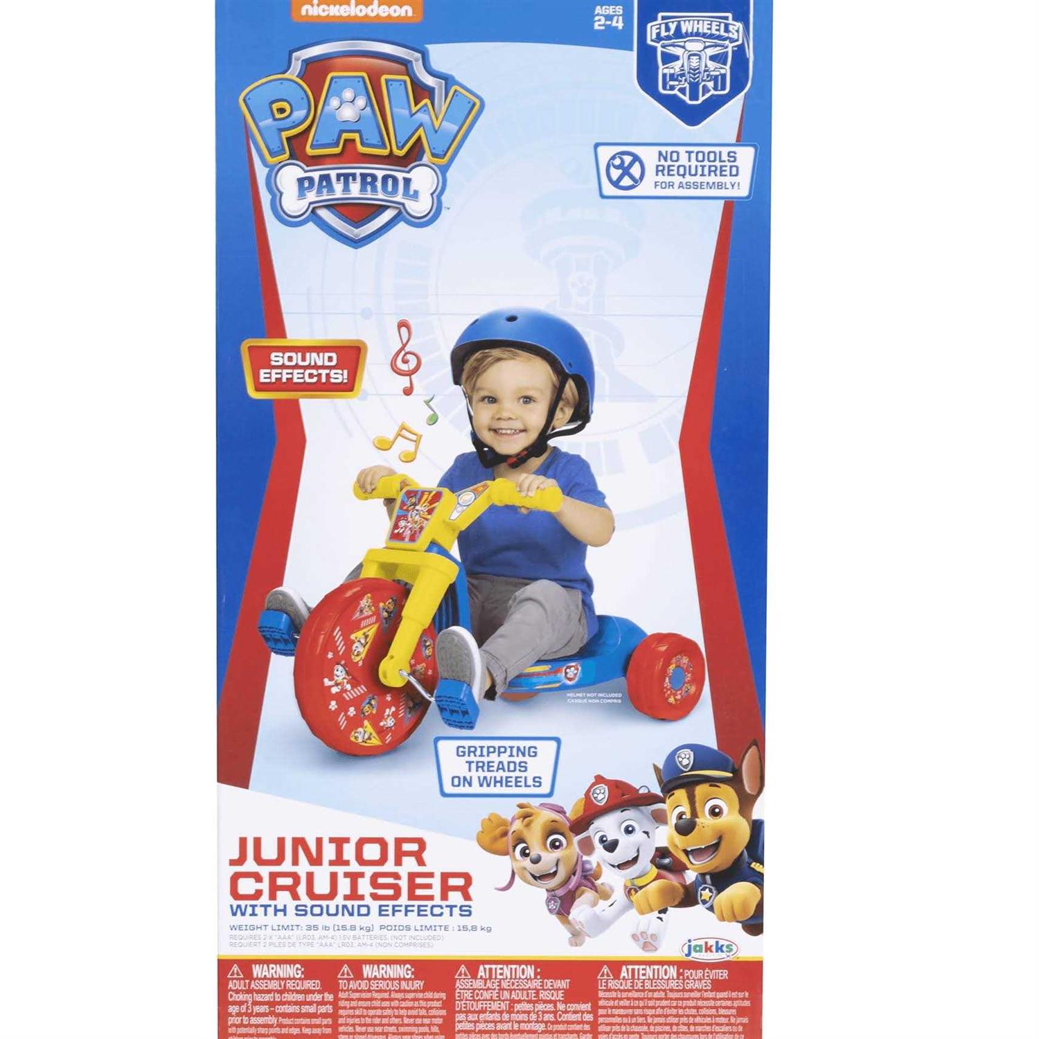 Its time to cruise around with your favorite PAW Patrol characters on the Fly Wheels Junior Cruiser. Featuring an extra-wide front wheel. Its designed for stability and maximum control for toddlers 2-4 years. The Junior Cruiser also includes mega grip tread on wheels for awesome street gripping action. Push buttons on the handlebar that will activate cool sound effects! Redesigned for easy assembly with no tools required. This junior cruiser is perfect for your little one. Happy Riding!