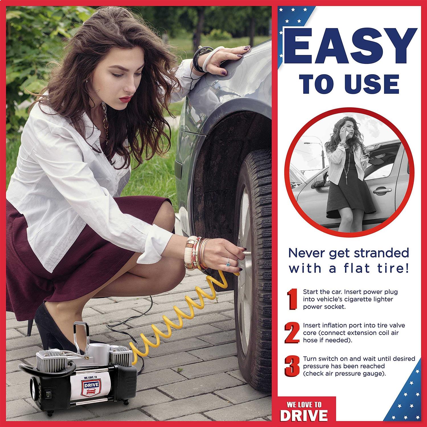 Carry everything you need in 1 included carrying case. Easy Function – Connect your electric air pump to your car’s 12V accessory socket or battery terminals. Easily fill all 4-6 of your tires with 10 ft. of flexible hosing and built-in pressure gauge. Complete Repair Kit – Durable product that’s made to last. Avoid getting stranded or having to use a donut spare thanks to your tire plug kit. Use a range of purpose-built tools to shape, fill, and seal small punctures wherever you are. Adaptable Air – Use your 12V air compressor kit to inflate a variety of tires and sporting equipment. Heavy Duty metal or hard plastic, Compress air up to 150 PSI and channel it through your choice of 3 different threaded adaptors. Your air-and-repair kit is backed by our commitment to your safe, successful travels. Prepare for Pops br br If you drive regularly, it’s only a matter of time before you have the unfortunate experience of being stranded on the side of the road with a flat tire. Enjoy 2 power source options, compatibility with 4 different types of air nozzle, and 6 hand tools and plugs for patching holes. Conduct repairs and maintenance using included neoprene gloves. Augment your 1 ft. source hose with 9 ft. of coiled hose. If your accessory socket plug pops a fuse, replace it with 1 of 2 included replacement fuses. br br Detailed Design br br Count on heavy-duty dependability that puts your mind at ease. Your pump is protected from overheating by heat sinks and automatic shutoff functions. If it gets too hot to touch, pick it up by its handle. If your car doesn’t have a 12V accessory socket, connect directly to your battery terminals with alligator clips, following the same safety protocols you would use to jump a battery. br br Variety of Uses br br Benefit from the versatility and portability of your air compressor kit in a range of applications. Take it into the wilderness and use it as an ATV flat tire repair kit. Conveniently air up beach balls, basketballs, rafts, and more. Park your car at the trailhead and top off your bike’s tire pressure before your trek. If it’s rubber and it rolls, your compressor kit is gold. br br The Love of Driving br br Trust us to understand you need a car emergency kit you can count on. Your flat tire repair kit was designed to address a full range of tire maintenance and repair needs, as well as outdoor activity inflatables.