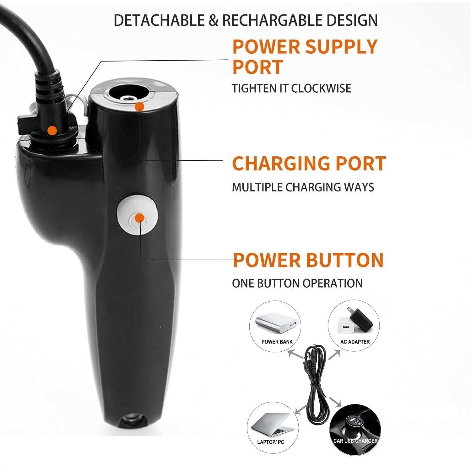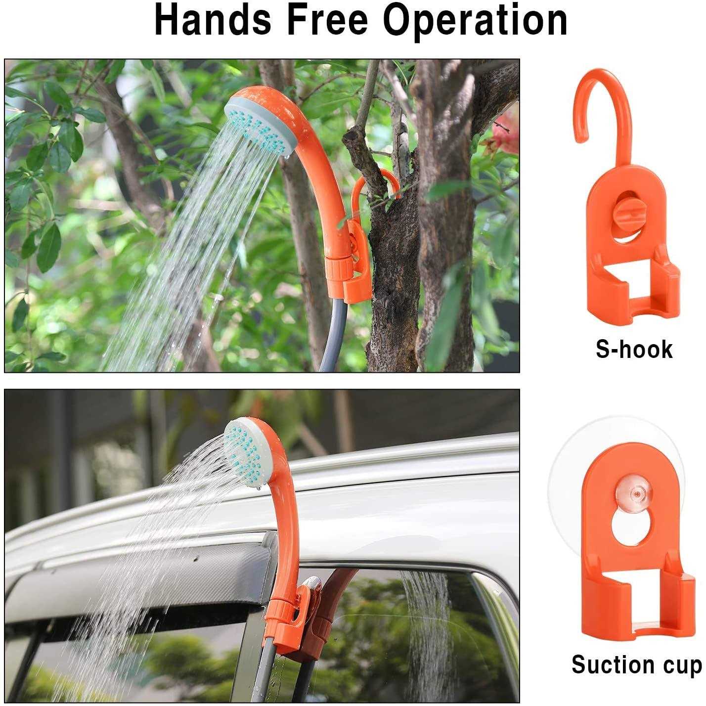 【Compact & Portable】portable shower convenient to carry and store In luggage, backpack or car trunk, perfect for outdoors, camping, hiking, kid bathing, pet cleaning, car washing, plants watering, windows and backyard cleaning or wash the sand on the beach. 【Easy to Operate】 Attach pump and shower head to the hose. Immerse the pump completely in the water, then use the hook, bracket or suction cup provided to secure the shower before turning on the power. Finally the water is pumped up from bucket and you get a nice flowing shower.Scientific and beautiful design, easy disassembly, charging and cleaning. 【Safe and Convenient】Outdoor camping shower water filter system to ensure that the water is clean and protect the shower head from being clogged.Portable shower can work in water temperatures ranging from 5°C to 60°C.The O-ring protects water from escaping from the connection of the shower hose and showerhead. 【Science & Durability】Hand-held independent power design, separated from the pump. There is no need to put the battery in the water, and the shower can be turned on and off at any time, effectively saving electricity and water. It also protects and improves battery life. 【Rechargeable Battery】 The portable electric shower has a built-in lithium battery,which can be used continuously for 45-60 minutes after being fully charged;A type-C charging cable, direct charge from USB port, car adapter or computer, laptop ( output of 5V/1A~2A ). 【What’s in the Box】 /b br 1 x Shower head and 1 x Pump br 1 x Battery br 1 x 6 ft (1.8 m) Hose br 2 x O-ring br 1 x Suction cap and 1 x Hook for hanging br 1 x Shower head holder br 1 x USB adapter cord br 1 x 2.6 ft(0.8 m) USB charge cable br br 【Versatile Shower System】 /b br Whether camping, hiking, gardening or cleaning, enjoy all the amenities of home without the need for plumbing. br Simply place the pump in a bucket of water, and watch as it pushes a continuous stream up the hose and out the handheld showerhead. br br 【Warning】 /b br 1. When using it for the first time, please use up the battery before charging. br Then fully charge it all at once before using it, which is good for battery life. br br 2. It can’t work when charging. When it is charging,the led light is green.The light will turn to red when fully charged in 2-5 hours. br br 3. Only charge this device with a 5v adopter or less. Do not charge it with an adapter that’s more than 5 volts. br br 4. Do not leave the motor working without water. br Do not put the shower into the water while the motor is working. Blocked water flow will cause damage to the motor and power supply. br Do not let the pump work for a long time, work for 10-15 minutes or so after a few minutes of rest, and then use the best. br br 5. Before use, after inserting the power cable into the power supply interface, be sure to turn and tighten the power supply to ensure that the power cable connector is not loose before normal operation. br br 6. Please keep the product dry after use and then store it. br br