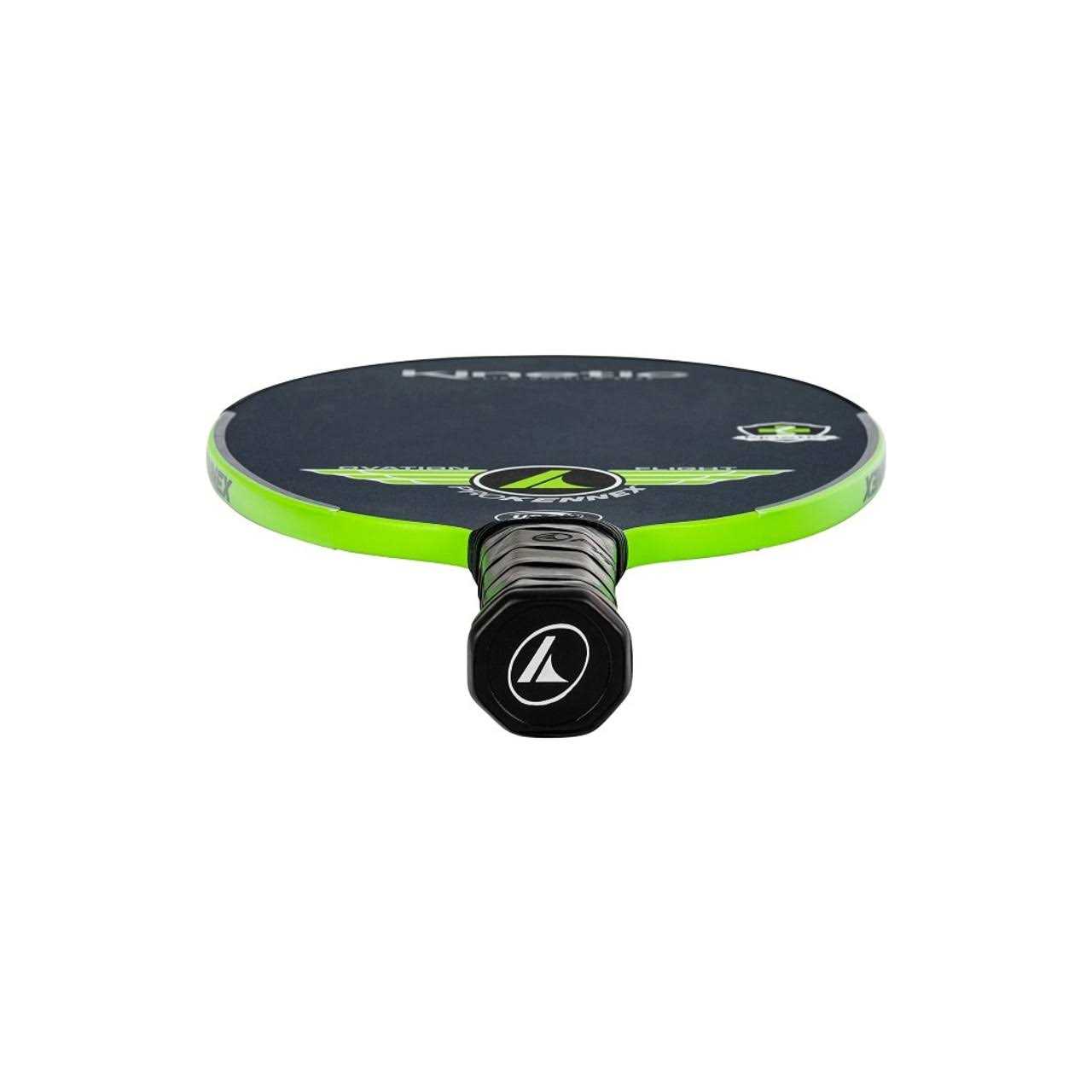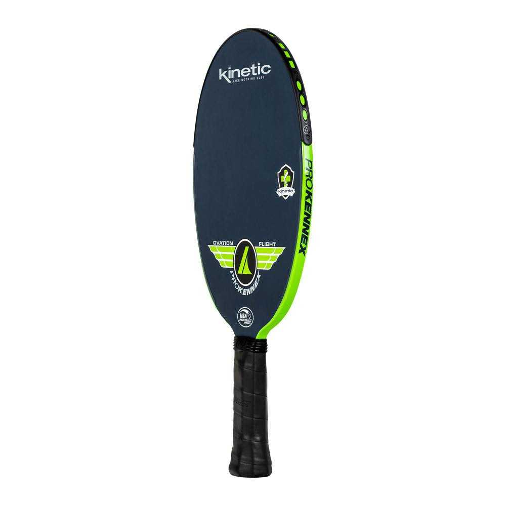 Packed full of amazing features, the Kinetic Flight Ovation Pickleball paddle will push you to new heights of speed and control. The Ovation version of the Flight paddle has a unique shape, the Oval. As such the point of impact of the paddle is in the center of the oval shape, making it perfect for former tennis players who like to watch the ball hit right in the middle of the paddle face. The oval shape also results in a slightly handle-heavy paddle. For the face, ProKennex has implemented a new Diamond Frost coating that offers longer contact and increased surface texture for more spin. The Air-O-Guard protective bumper is fully replaceable, so if it ever gets scratched, you can simply change one piece and not buy a new paddle. Tungsten-filled chambers in the ProKennex exclusive Kinetic system help prevent injury and reduce shock. It’s ideal for avoiding pickleball elbow and enjoying longer, painless games. This is a dynamic pickleball paddle that is not only comfortable to use, but also ideal for high level play.