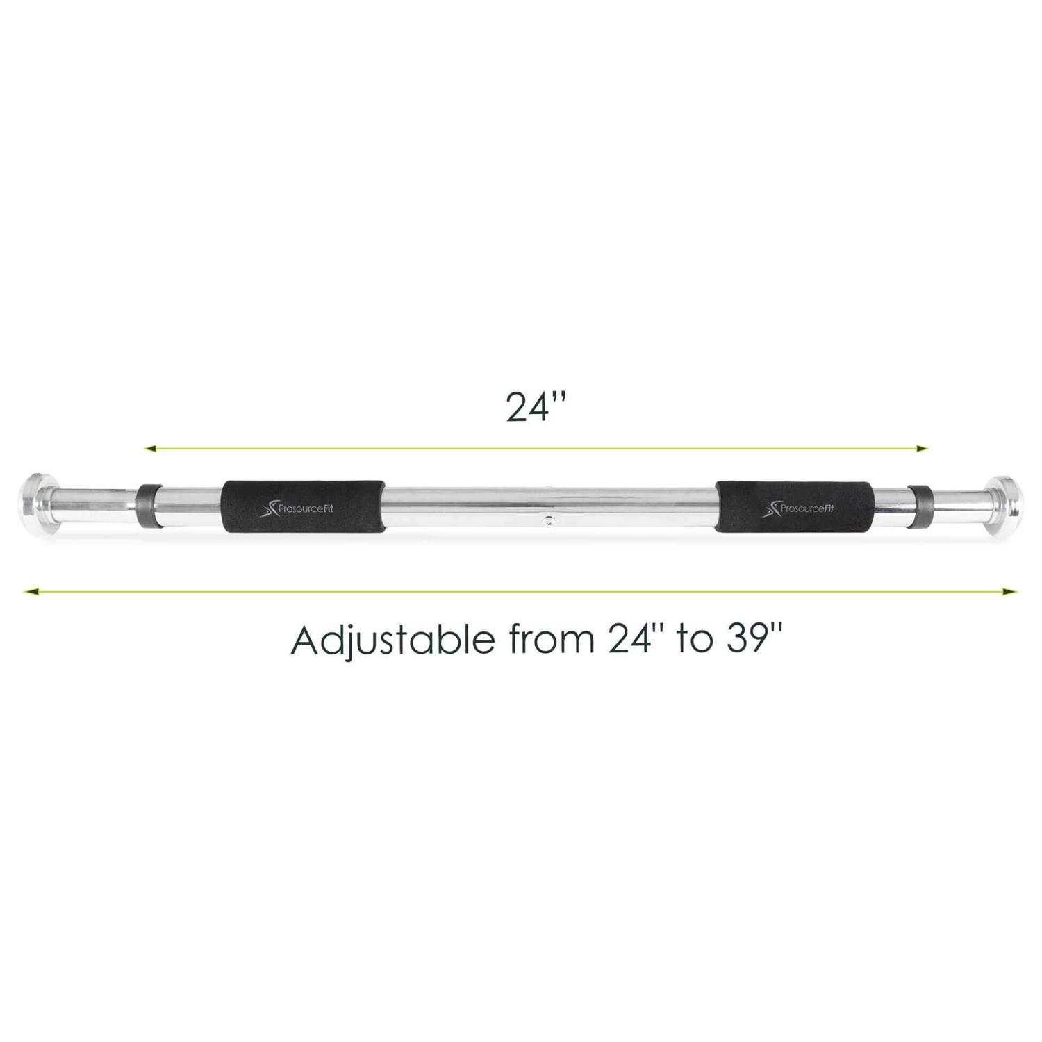 Build your upper body muscles faster with the convenient Prosource Fit Doorway Pull-Up Bar. The adjustable bar can be installed it in any doorway at home between 24” and 39” for use at anytime. It’s perfect for squeezing in quick workouts, and improving upper body strength with pull-ups and chin-ups. The heavy duty steel workout bar holds up to 220 pounds for pull-ups, chin-ups, and leg raises. You can also place it lower in the doorframe for triceps dips, push-ups, and as an anchor for floor crunches. Cushioned foam grips prevent slipping and are comfortable for hands. It comes with all mounting hardware so you can get it installed quickly for immediate use.