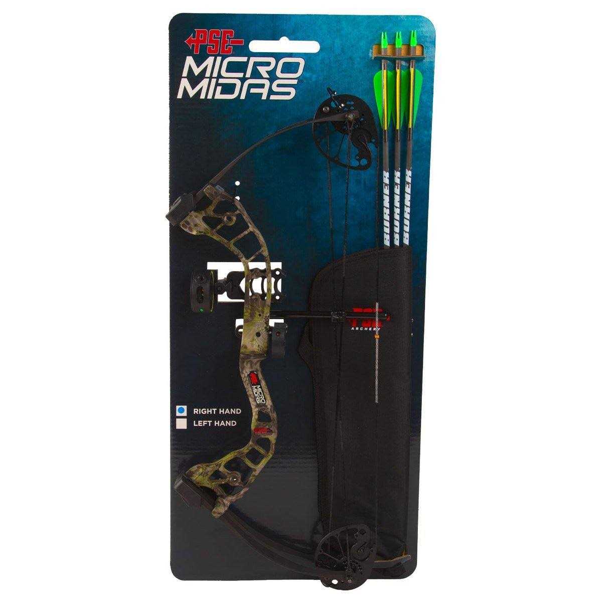 Micro Midas: When your young shooter is ready for their first compound hunting bow, the PSE Micro Midas delivers an ideal combination of affordability and low-key performance. Designed with the smaller shooter in mind, the Micro Midas features a 6 Inch Brace Height, 24 Inch Axle-to-Axle, and a Draw Length Range of 14- Inches TO 24- Inches. The Micro Midas also packs a punch, with shooting speeds of up to 235 fps.