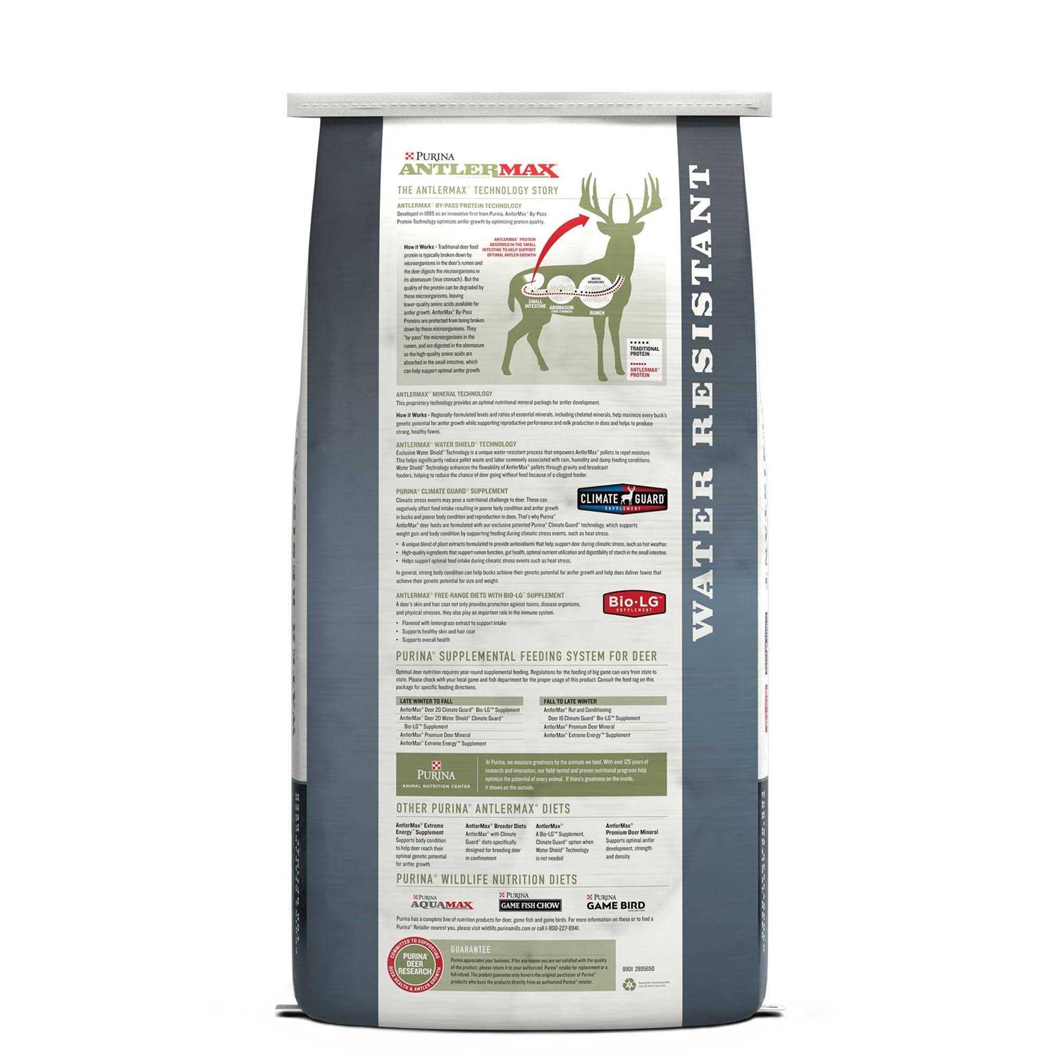 Purina; AntlerMax; WATER SHIELD; CLIMATE GUARD; Deer 20; Pellet; For all life stages deer and elk; 20.00% Protein (min.) ; 3.00% Fat (min.) ; Supports overall health; Encourages reproductive performance; Encourages antler growth; 50lbs. ; 3007572-206; ANTLERMAX WATERSHIELD DEER 20 with CLIMATE GUARD and Bio-LG FEED SUPPLEMENT is a researched 20% protein ration. Specifically reformulated for what free range deer require to support overall health, reproductive performance and antler growth.