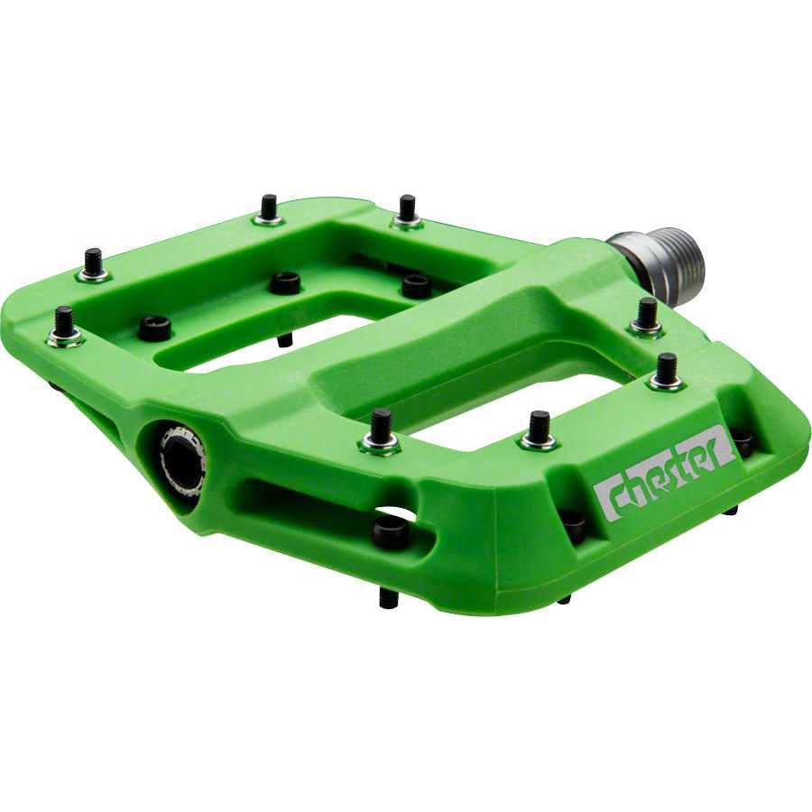 RaceFace Chester MTB Pedals Lightweight and durable, the RaceFace Chester MTB Pedals feature a composite, plastic body for an unrivalled combination of value and performance. The composite body is built strong and sees a concave design to allow your shoes to sink into the pins for glue-like grip. With 16 pins per pedal, they offer a planted feel and are a perfect pairing for modern flat pedal shoes. The Chester pedals take harsh landings and rock strikes in their stride, with the nylon body glancing off blows without hangup, and the tough cro-mo axles resisting flex on drops. The sealed bearing design resists ingress from dirt and water, ideal for wet, winter rides. Fully serviceable and rebuildable, they offer excellent longevity to last through seasons of abuse. The large 110 x 101mm platform is supportive and confidence-inspiring and sees a low profile design to drop your centre of gravity.