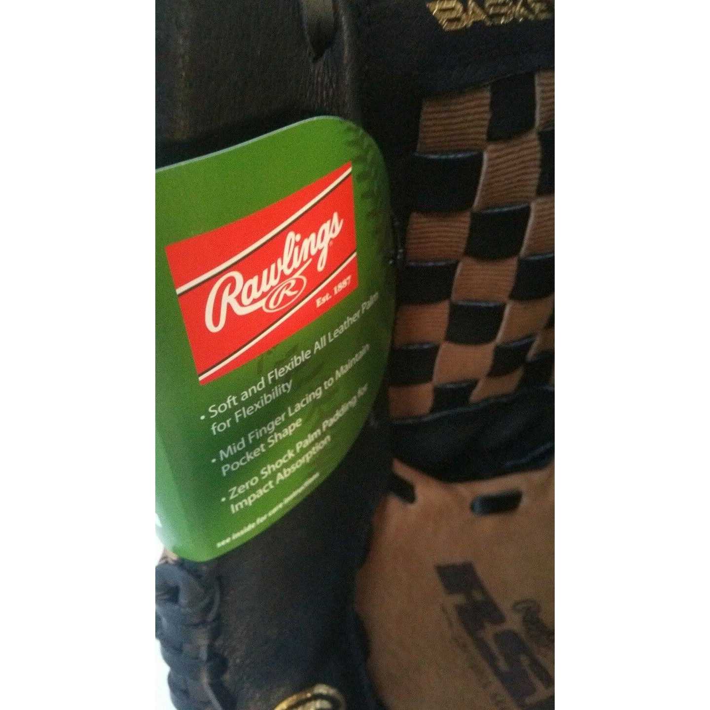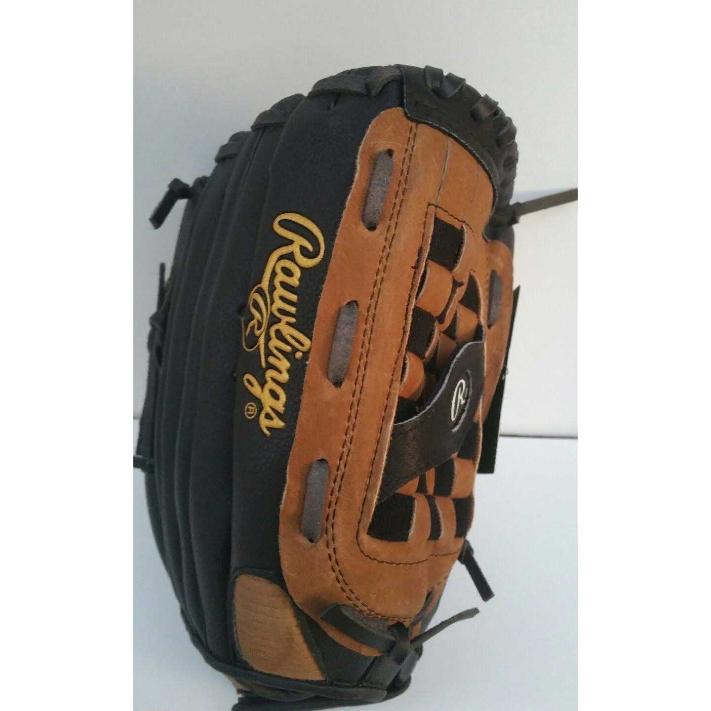 Soft, flexible leather palm Mid-finger lacing Zero-shock palm padding Left hand glove for right hand throw The softball glove is from Rawlings, a company known for their sporting equipment expertise. It is made from leather and features traditional styling with an updated flair. The black and tan glove is accented with a checkerboard pattern web pocket. It is suitable for first-time or recreational player or for those who are experienced on the diamond. The men’s or women’s glove fits on the left hand, allowing for right hand throwing.