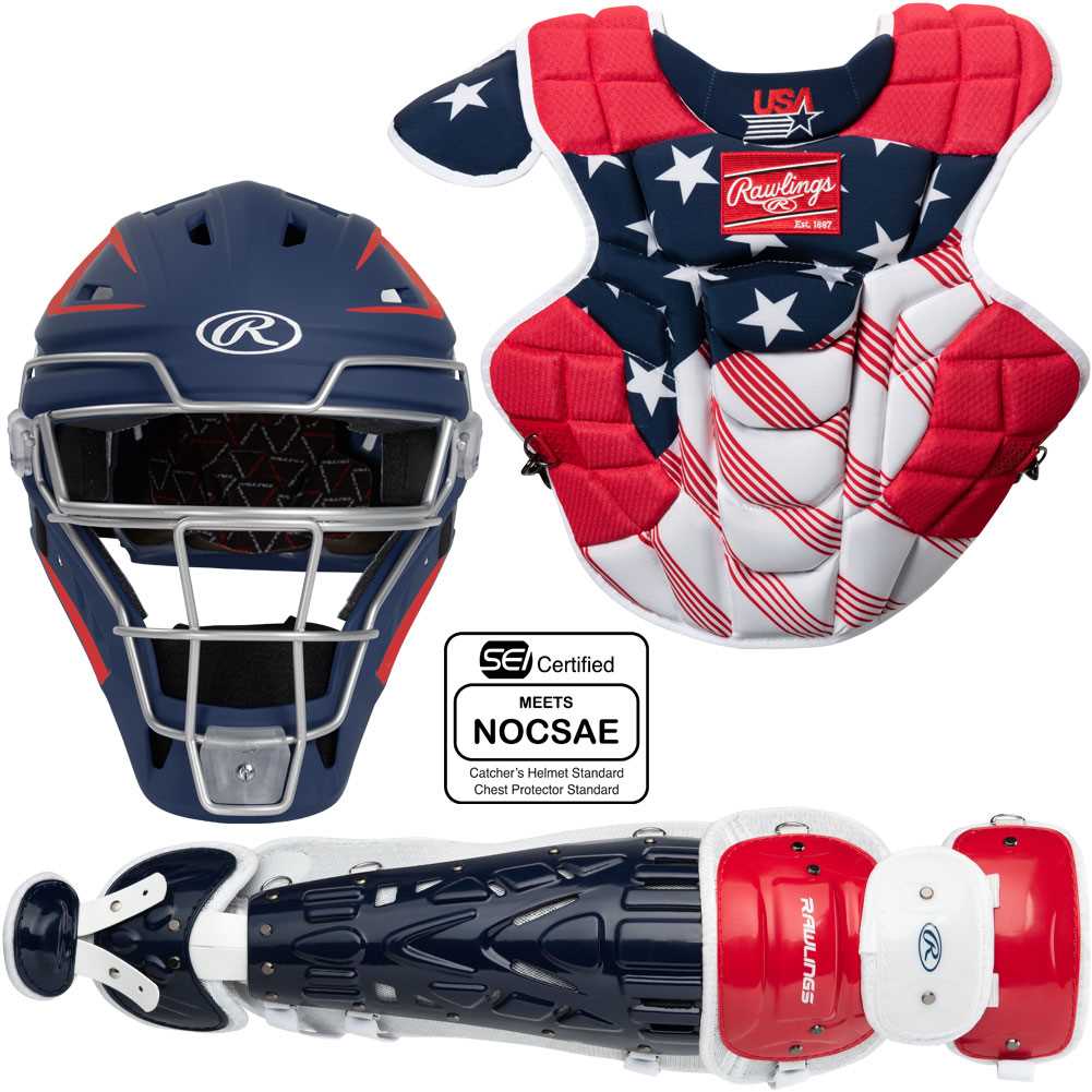 Rawlings Intermediate Exclusive Edition Velo 2.0 USA Catcher s SetFeatures * Set includes helmet chest protector and legA guards * Recommended for ages 12 to 15 * Helmet: * Hockey-style catcher s helmet with two-tone matte finish * Protective ABS shell is vented for breathable comfort * Moisture-wicking liner dries sweat quickly to keep you dry * High-strength cage provides increased impact protection * Adjustable chin pad for comfort and ease of communication * 3-way adjustable back plate for a custom fit * Meets NOCSAEA standards * Size: Fits 6 1/2 to 7 * Chest Protector: * Arc Reactor Corea combines polyurethane foam with engineered polymer plate * Absorbs forceful impacts while dampening ball rebound for better control * Dynamic Fit Systema 2.0 four-point shoulder and back harness for form-fitting control * Meets NOCSAEA standards (Commotio Cordis Certified) * Size: 15.5 * Leg Guards: * Lightweight design for comfort and mobility * Triple knee construction for extended coverage and protection * Heat Exchangea foam side flaps increase airflow to keep you cool * Over-the-shoe elastic strap on toe flap improves the fit for better protection * Supertoea for ultimate instep protection from pitches and foul tips * Size: 15.5 Catcher s HelmetFeatures an adjustable chin pad for comfort and ease of communication.Chest ProtectorArc Reactor Corea blends impact absorbing foam and an arched engineered polymer plate together for increased protection.Leg GuardsHeat Exchangea foam technology side flaps increase airflow to keep you cool throughout every game.