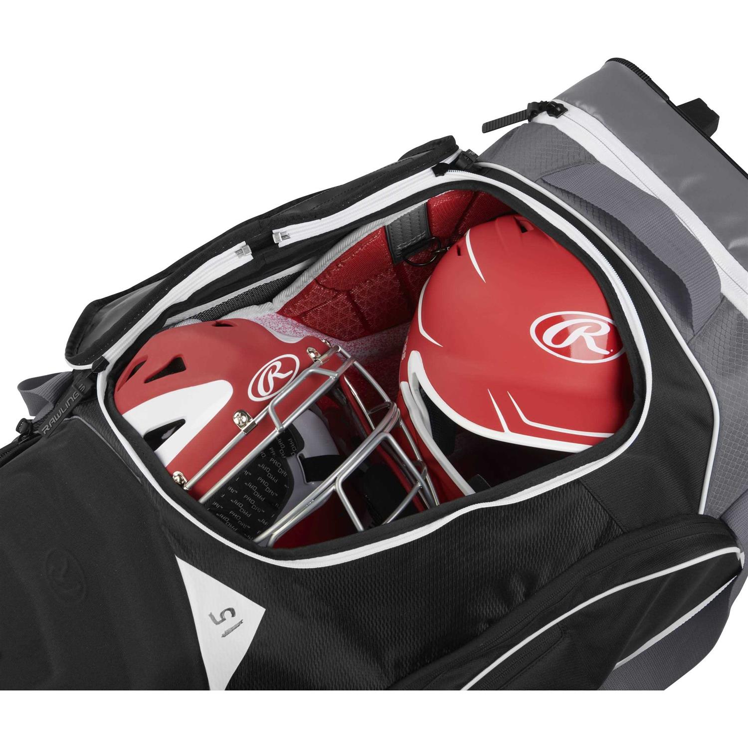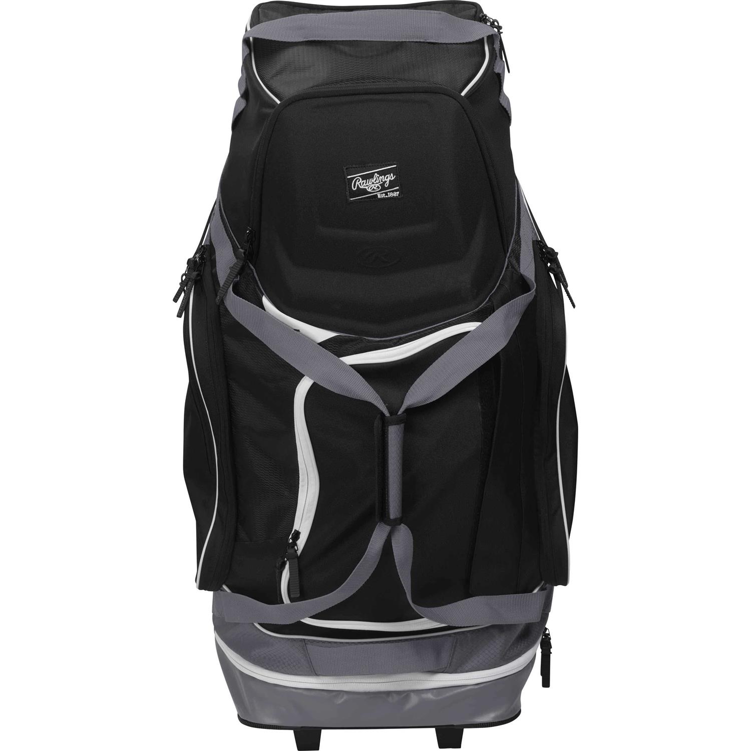 The Rawlings Wheeled Equipment Bag features a large main compartment and hard molded pocket for protective glove storage. This bag is also designed to stand straight up and has separated pockets for shoe storage. Full bottom rails and rugged, durable wheels. Bat compartment that fits up to 4 bats.