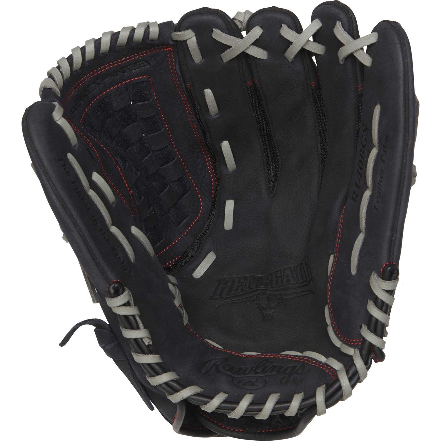 The Renegade Series 14”Softball Glove by Rawlings is designed for comfort and fit with cushioned palm, padded index finger, and an adjustable hook and loop strap. Leather shell palm construction provides durability and shape retention. This softball glove features a durable and lightweight pro mesh back design for optimal balance and added quickness.