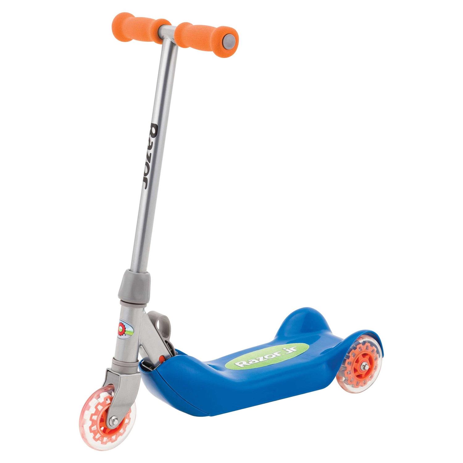 Ride to school fast with this Razor Jr. The three-wheel design provides stability, while the sturdy lightweight construction delivers enduring durability. Folding Kiddie Kick scooter has a wide slip-resistant polypropylene deck for a secure grip, and the soft foam handles offer plush comfort. Extra-wide slip-resistant deck Allows you to easily grip the deck with your foot as you ride. Weight capacity of 44 lbs. Enables safe riding. Adult assembly required. Suitable for children ages 3 and up Enjoy safe riding. Steel handlebars with foam grips Provide a comfortable grip while riding. Three polymer wheels Offer an extra-smooth and comfortable ride. Foldable design Features a steel frame and collapses for easy storage.